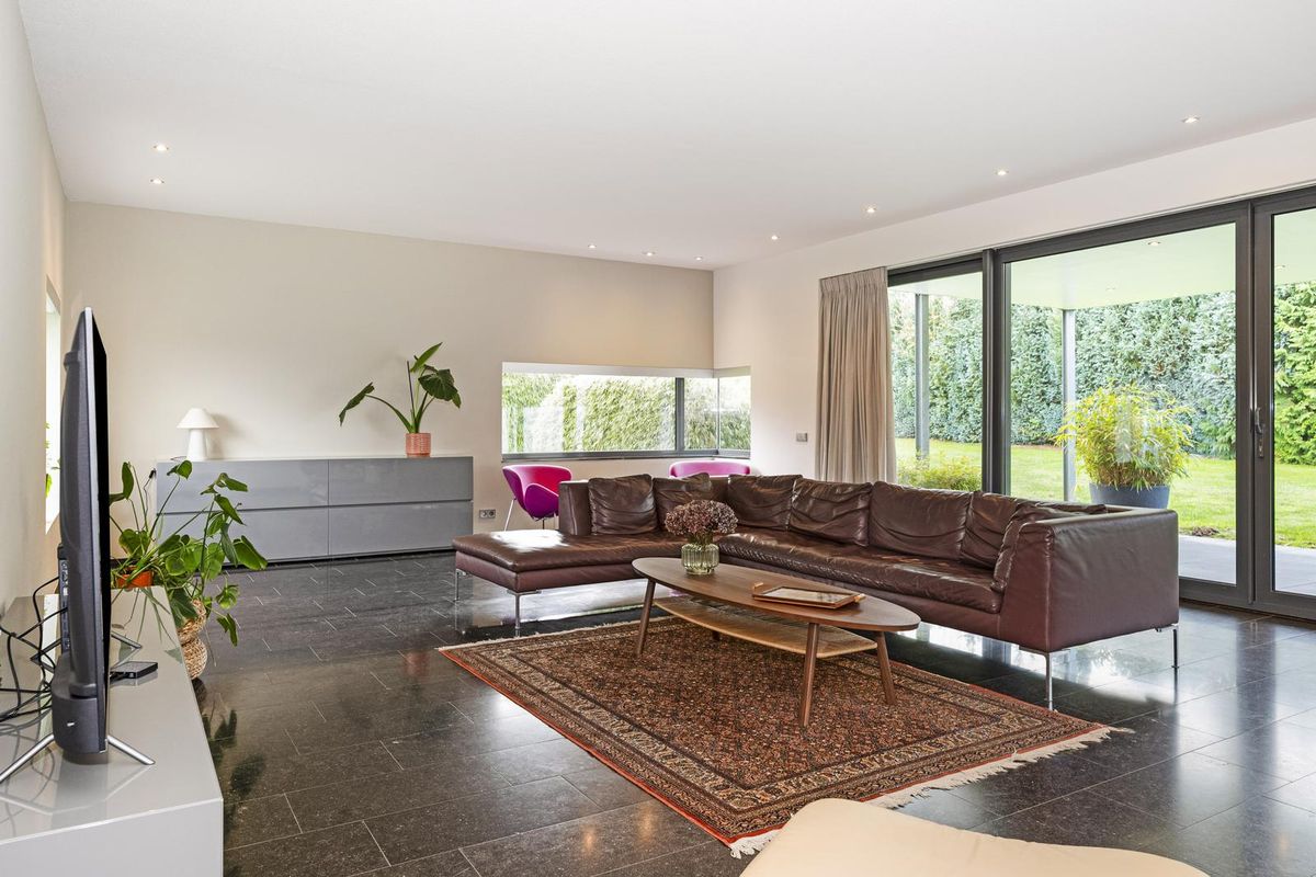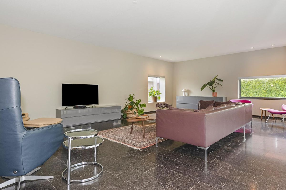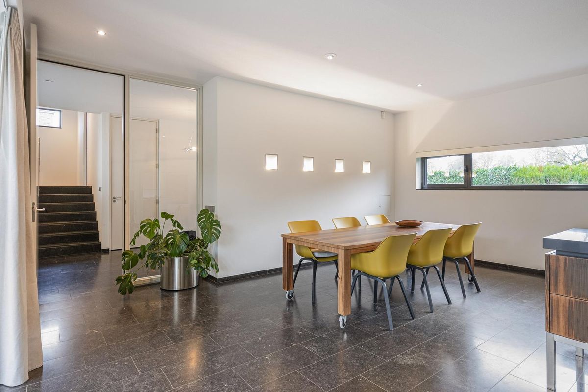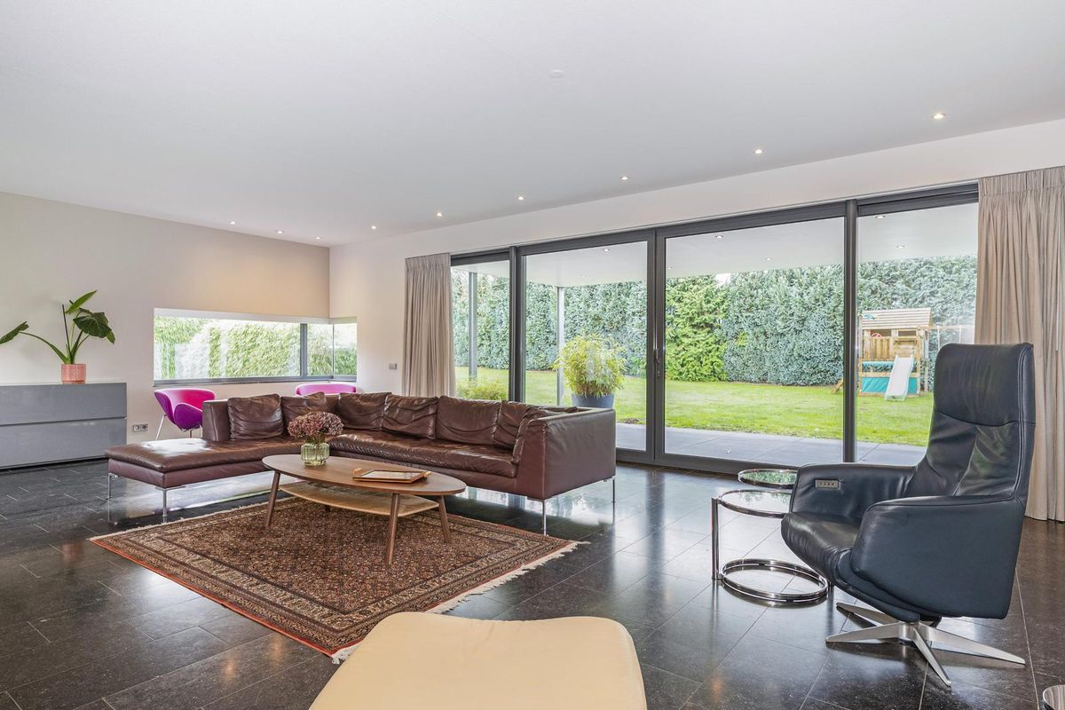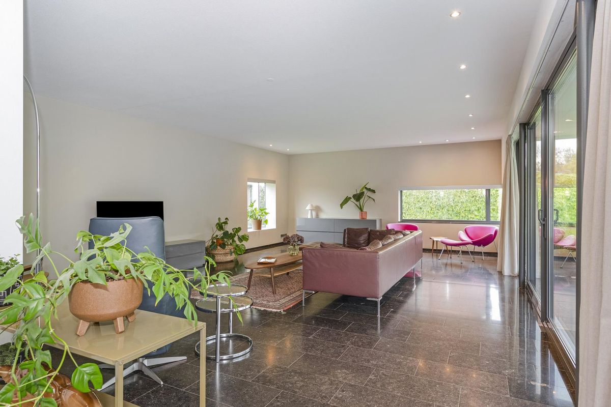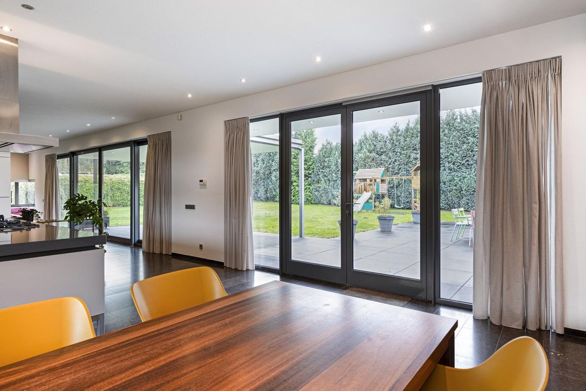 Vanuit de hal bereikt u de grote woonkamer van ruim 9 meter lang, voorzien van een sfeervolle gashaard en een brede schuifpui die direct aansluit op het terras. De halfopen keuken is uitgerust met een luxe, op maat vervaardigde keukencombinatie met gaskookplaat, combi-oven, afzuigkap, koelkast en vaatwasser. Woonkamer en keuken beslaan samen circa 85 m². Zowel de woonkamer als de keuken en hal zijn afgewerkt met prachtige Belgische hardstenen vloeren, wat de woning een luxe en tijdloze uitstraling geeft.