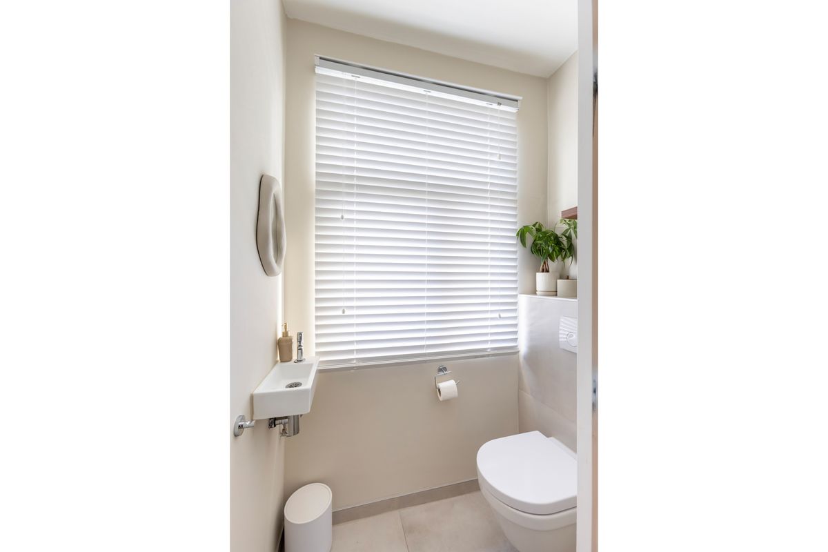 De badkamer is stijlvol en modern ingericht met beige wand- en vloertegels, een hout-look wastafelmeubel met organische spiegel, een douchecabine met regendouche. Ook hier is het plafond voorzien van inbouwspotjes. In deze ruimte bevindt zich tevens de opstelling voor de wasmachine en cv-ketel (Intergas HRE, 2022).