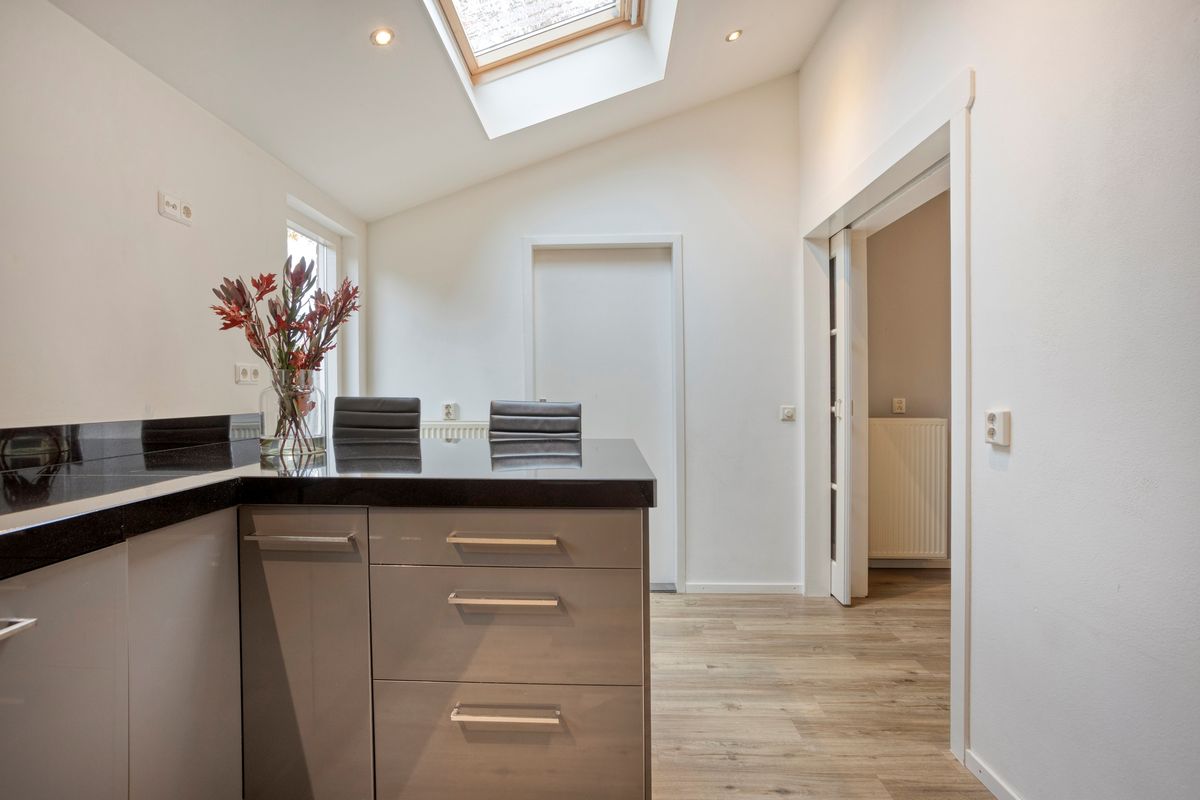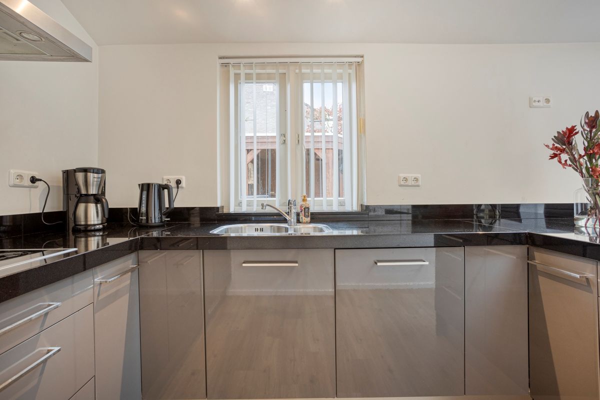 • De moderne inbouwkeuken beschikt over een stijlvol natuurstenen aanrechtblad met een eetbar. In de keuken is een close-in boiler aanwezig zodat je altijd snel kunt beschikken over warm water.