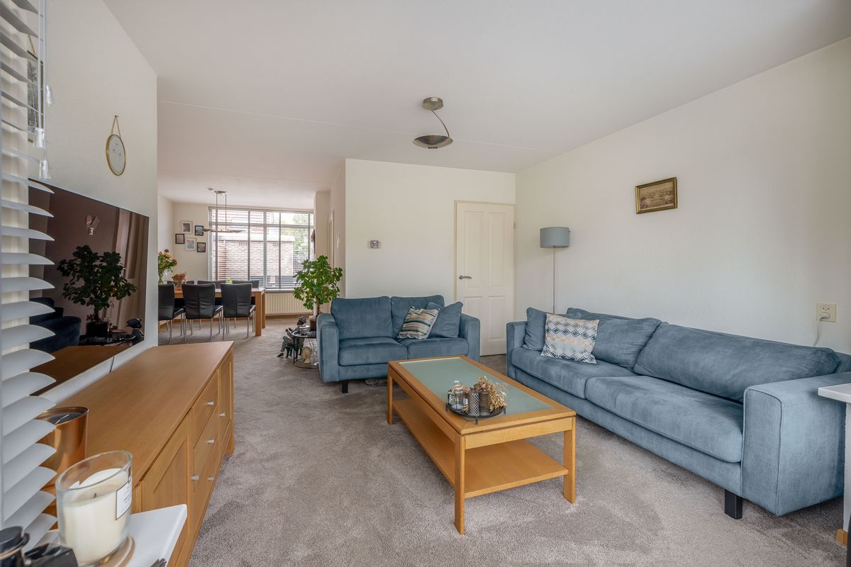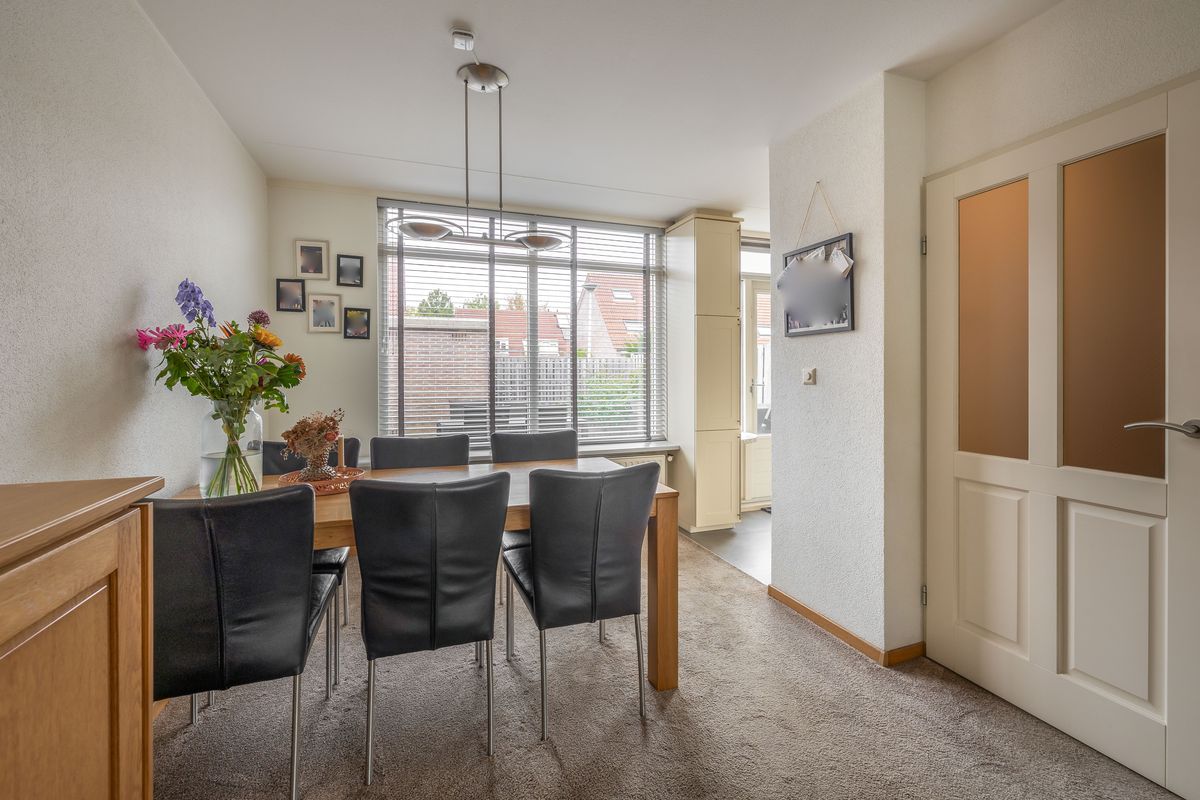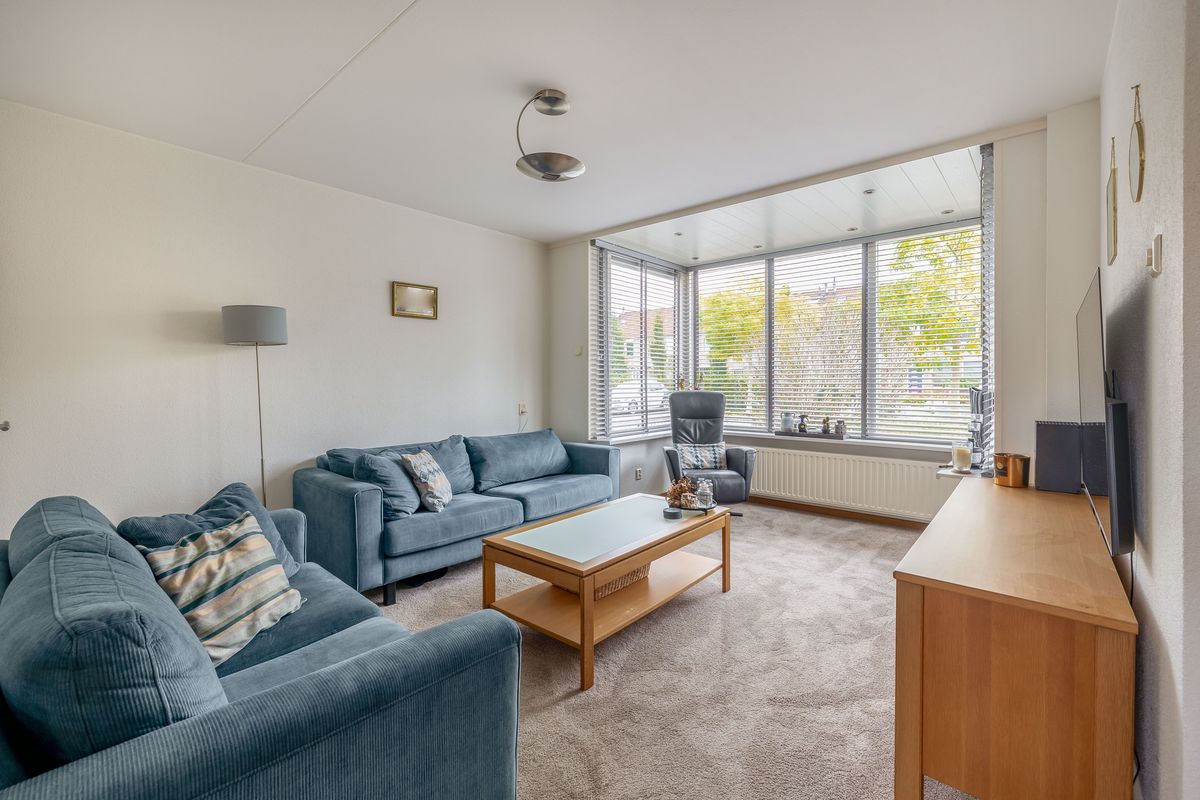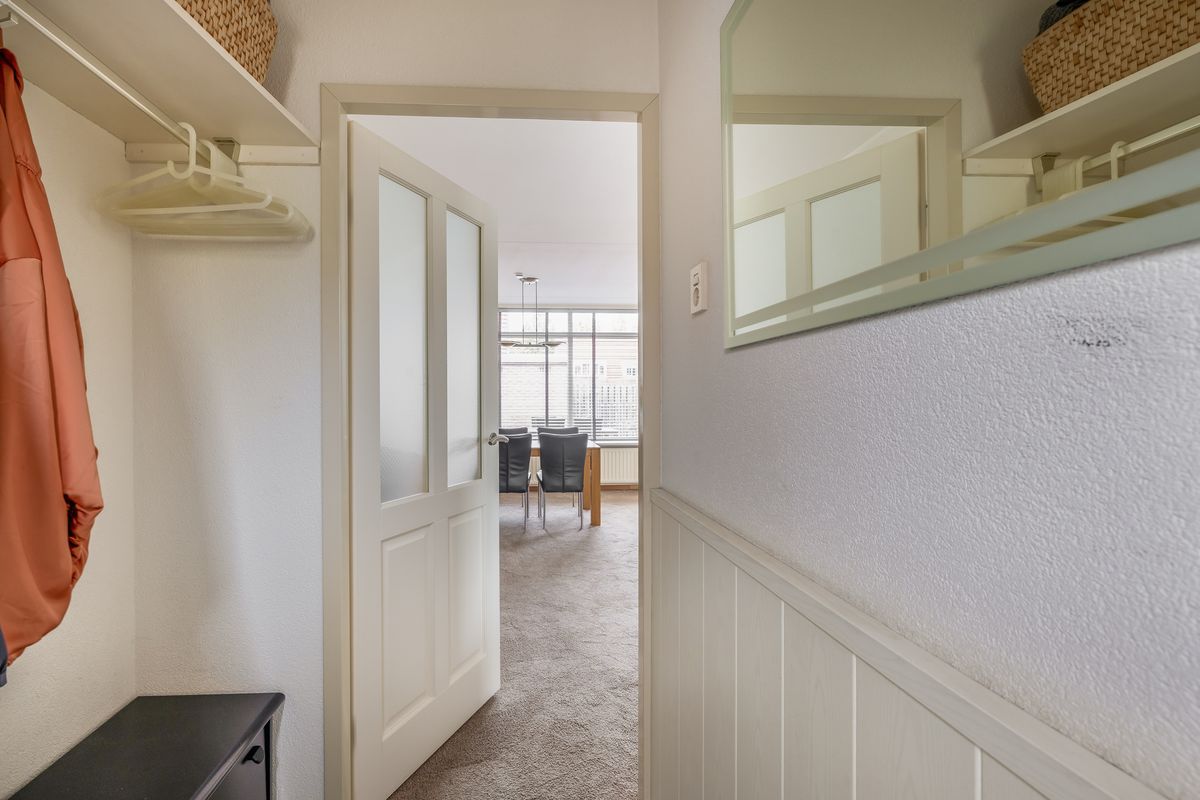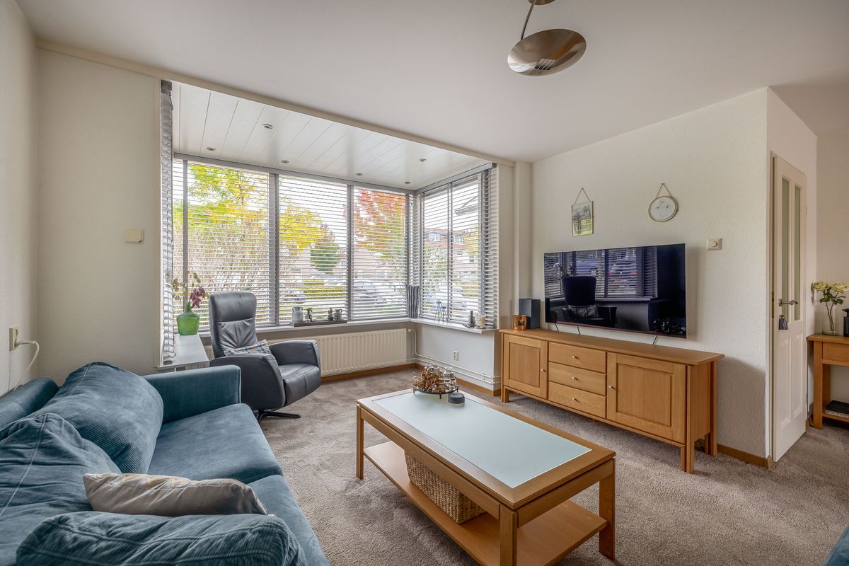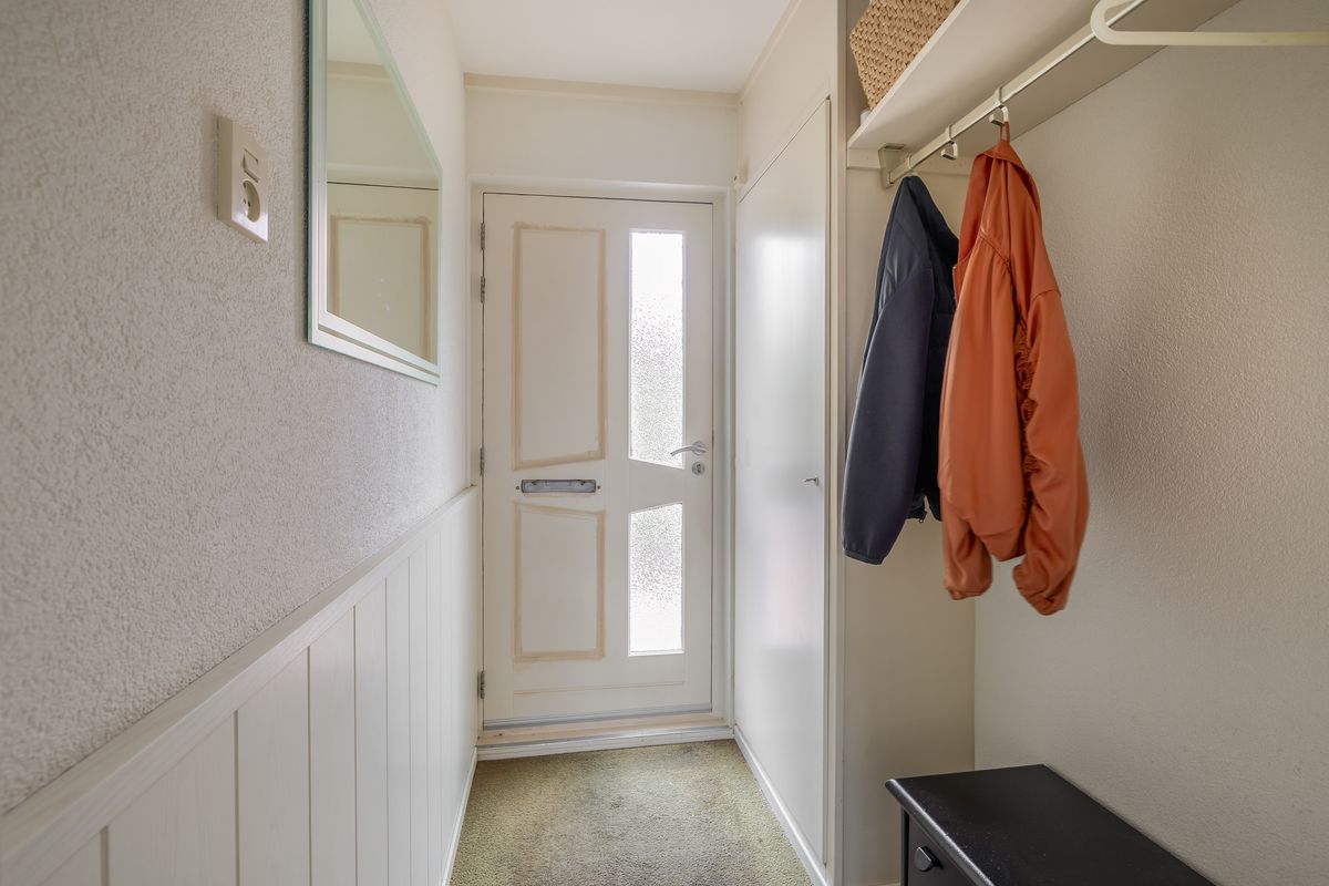 Bij binnenkomst valt direct op hoe verzorgd deze woning is. Je komt binnen via een kleine hal met lambrisering en spachtelputz, voorzien van een garderobe en de meterkast. Vanuit deze hal heb je toegang tot de woonkamer. De uitgebouwde woonkamer bevindt zich aan de voorzijde en heeft een gezellige, praktische indeling. Er is voldoende ruimte voor een grote hoekbank en dankzij de brede ramen komt er veel daglicht binnen. Onder de trap is bovendien een ruime bergkast aanwezig.
