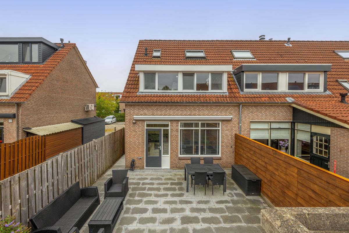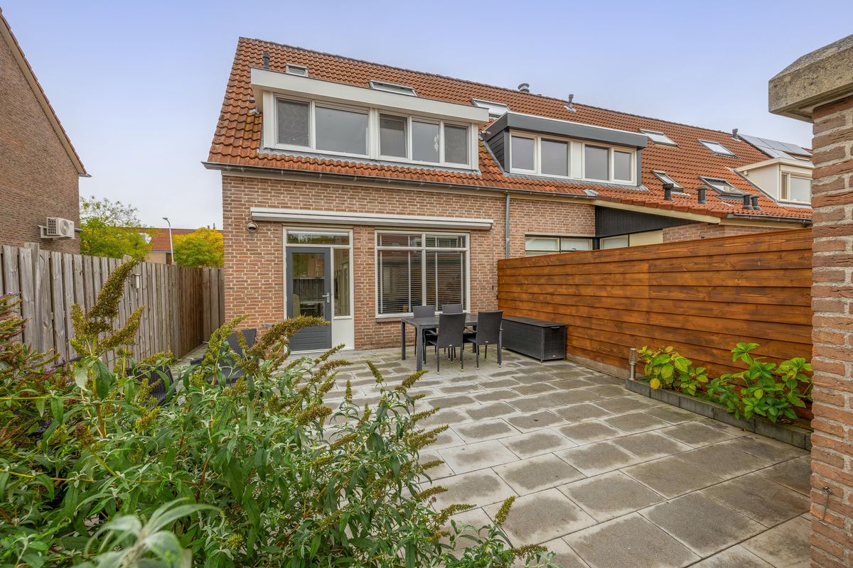 Via de keuken stap je zo de keurig aangelegde achtertuin in. Deze tuin is netjes onderhouden, voorzien van sierbestrating, houten erfafscheidingen en vaste planten in verhoogde borders. Dankzij de ligging op het noordwesten kun je hier tot in de avond van de zon genieten. Door de hoekligging heb je bovendien veel privacy en extra buitenruimte aan de zijkant van het huis.