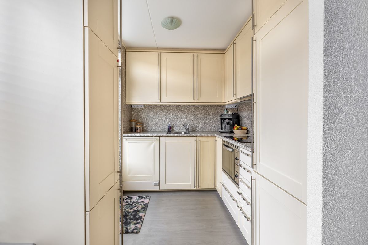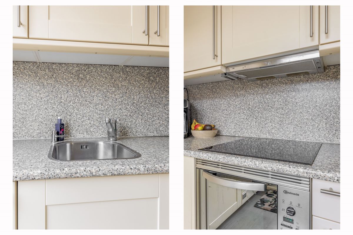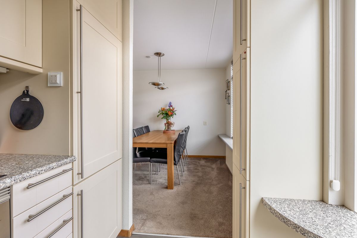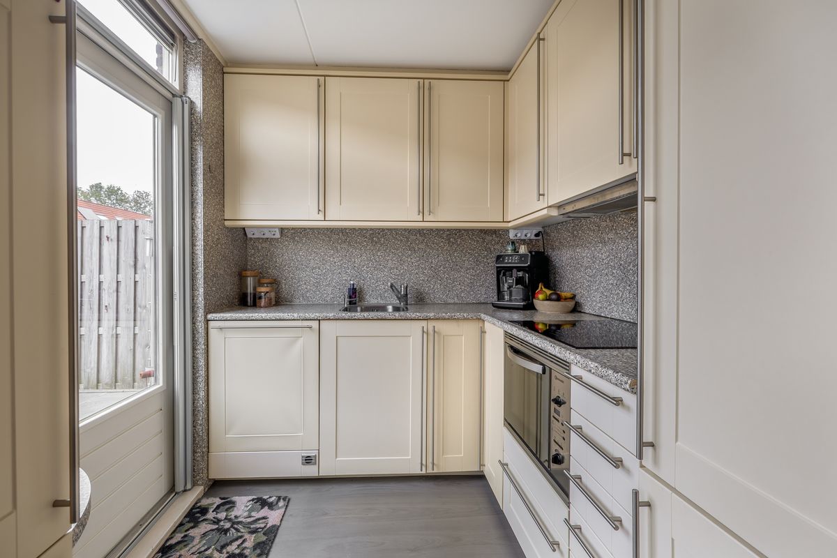 De (half)open keuken aan de achterzijde is uitgevoerd met vanillekleurige kastfronten, een gemêleerd wit/grijs werkblad en diverse inbouwapparatuur, zoals een vaatwasser, combimagnetron, inductiekookplaat en koel-vriescombinatie. Tussen de woonkamer en de keuken is plek voor een ruime eettafel voor zes personen.