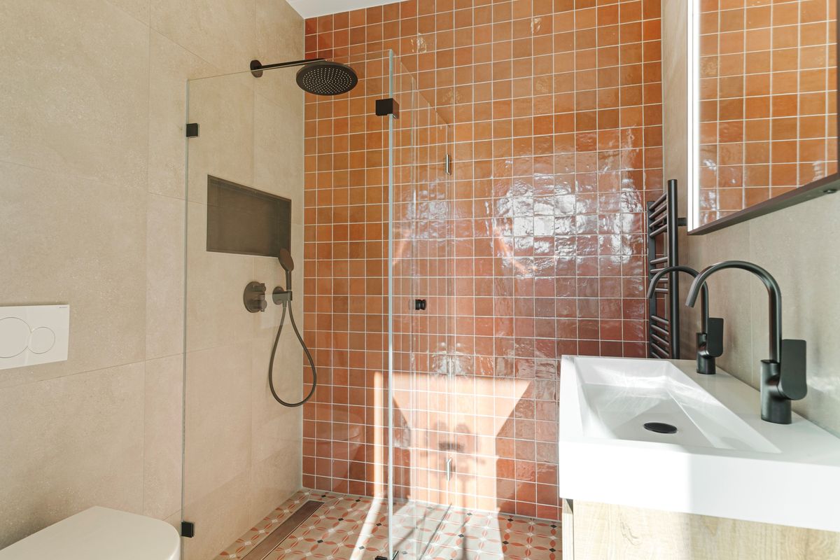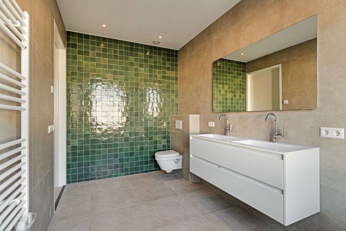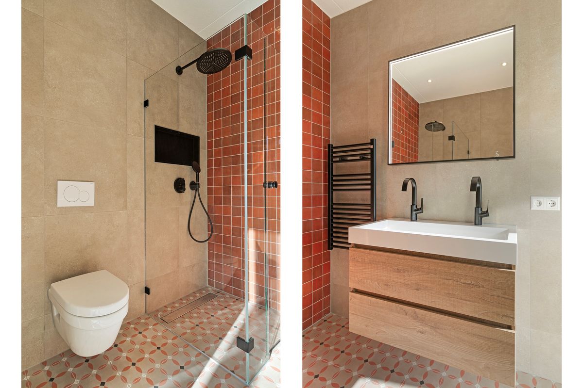 You take the stairs up to the first floor where you will have acces to 2 bedrooms and both bathrooms. The first bathroom is very spacious with a double sink and a full lenght mirror above it. It has a bathtub with a shower and a toilet with towel radiator. The first bedroom has space for a double bed and a closet. The master bedroom is very specious and has big glass doors which fully open. This bedroom also has an ensuite bathroom with a rain shower, double sink, towel radiator and toilet.