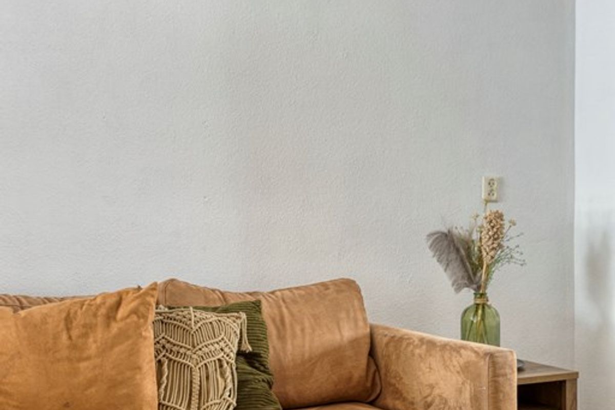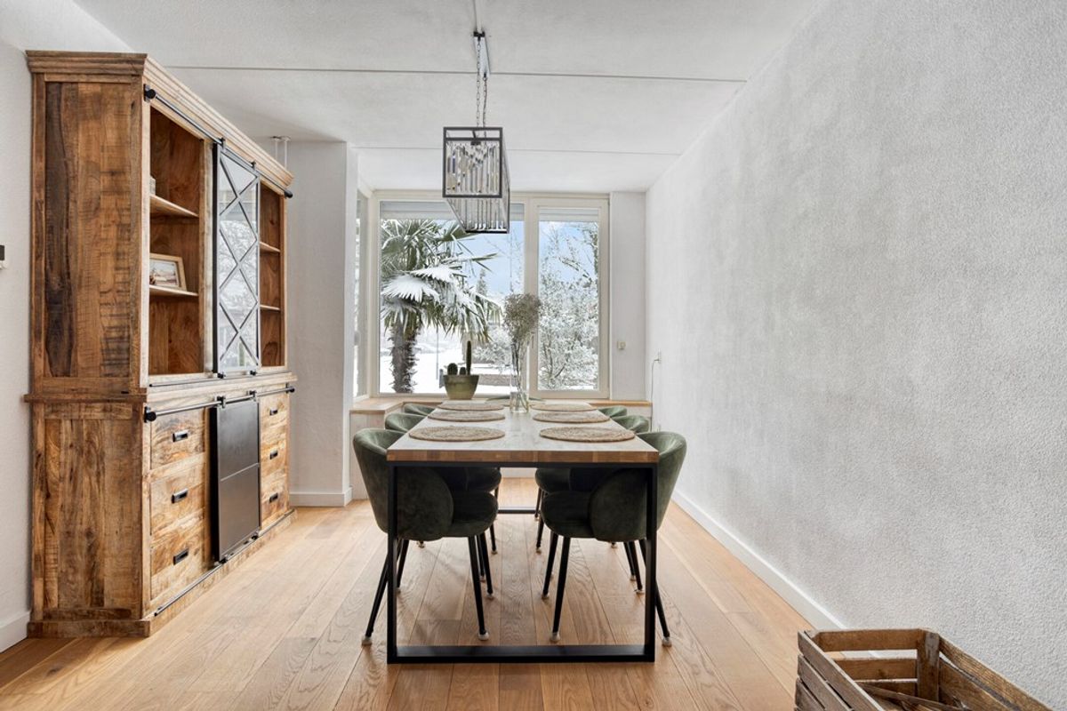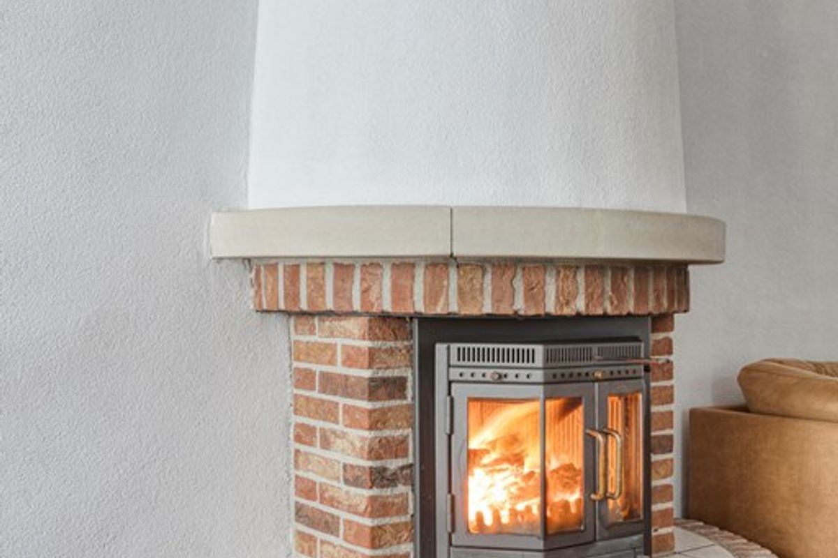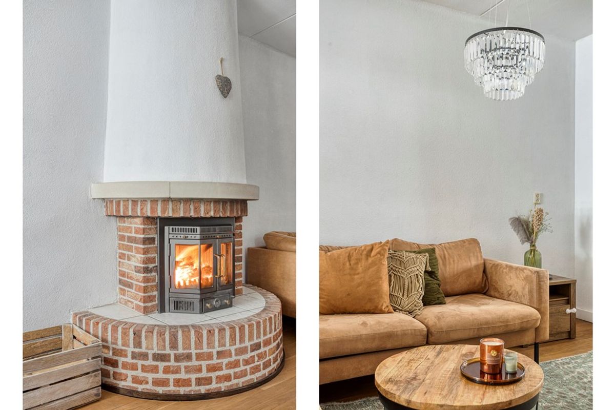 De sfeervolle woonkamer beschikt over fraaie eikenhouten vloerdelen en wordt extra gezellig gemaakt door de schouw met houtkachel. Praktisch is de vaste kast onder de trap. Dankzij de openslaande tuindeuren sta je in direct contact met de tuin en de royale veranda – een heerlijke plek om binnen en buiten met elkaar te verbinden.