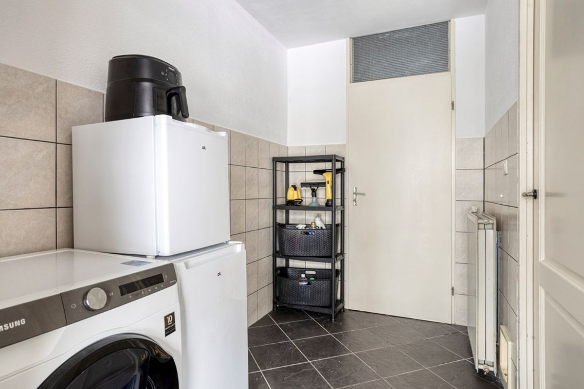 Aansluitend bevindt zich de bijkeuken met wasmachineaansluiting en toegang tot zowel de tuin als de garage – ideaal voor extra bergruimte en dagelijks gemak.