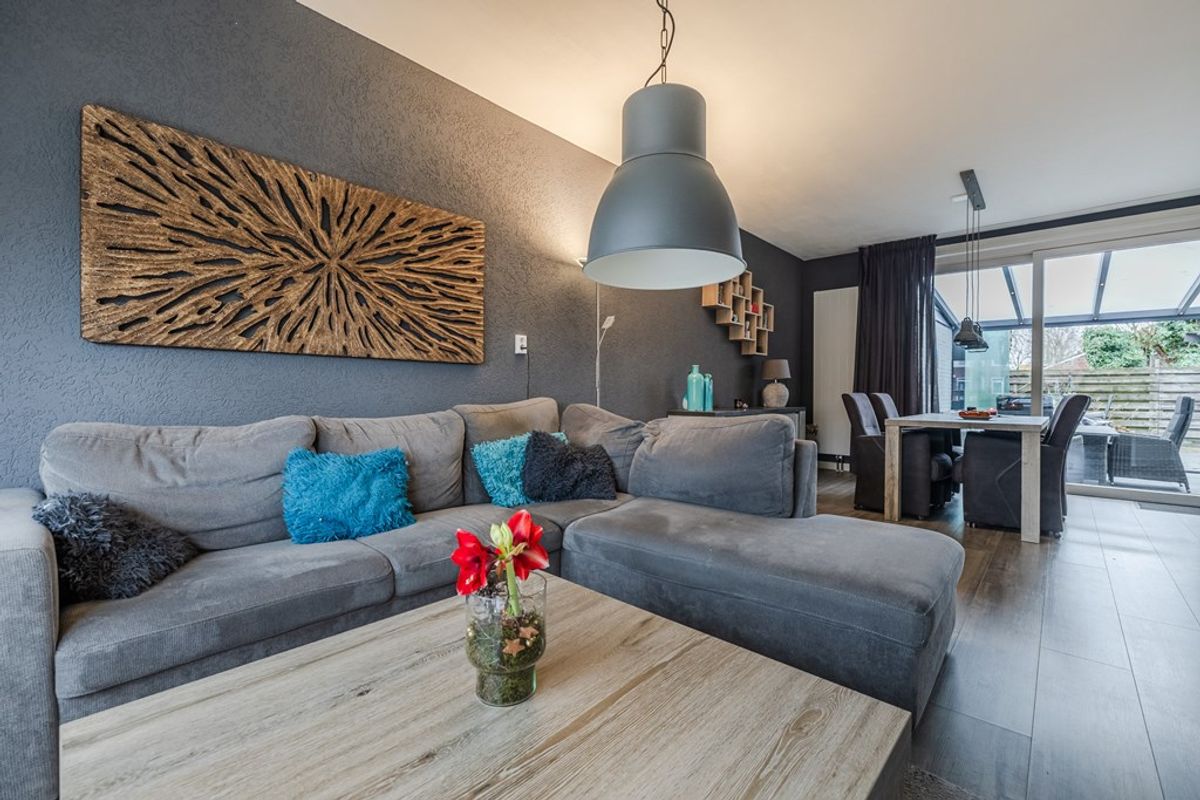 - Woonkamer met schuifpui naar tuinkamer en voorzien van laminaat vloer