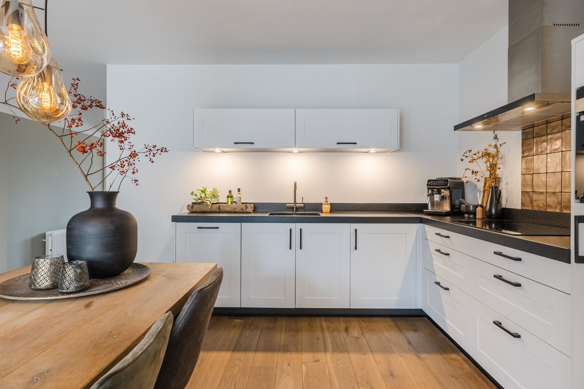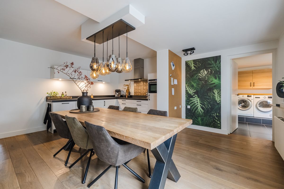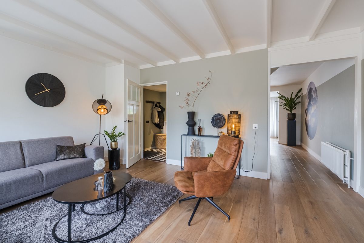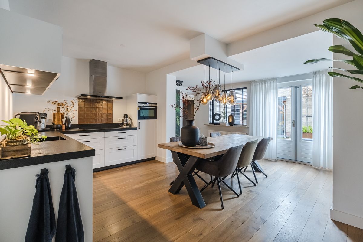 De lichte woonkamer straalt warmte en gezelligheid uit. Aan de achterzijde bevindt zich de uitgebouwde woonkeuken (2020). De moderne keuken is voorzien van luxe inbouwapparatuur, een vaste kastenwand en openslaande deuren naar het terras met sfeervolle overkapping.