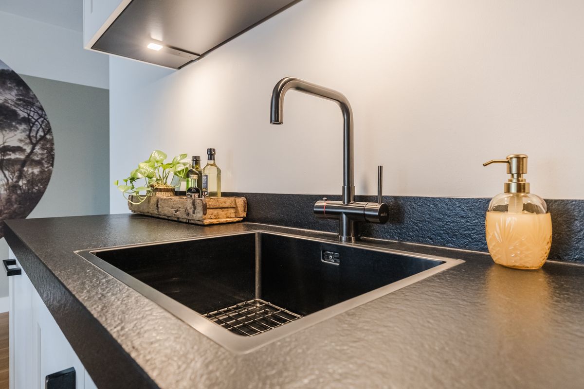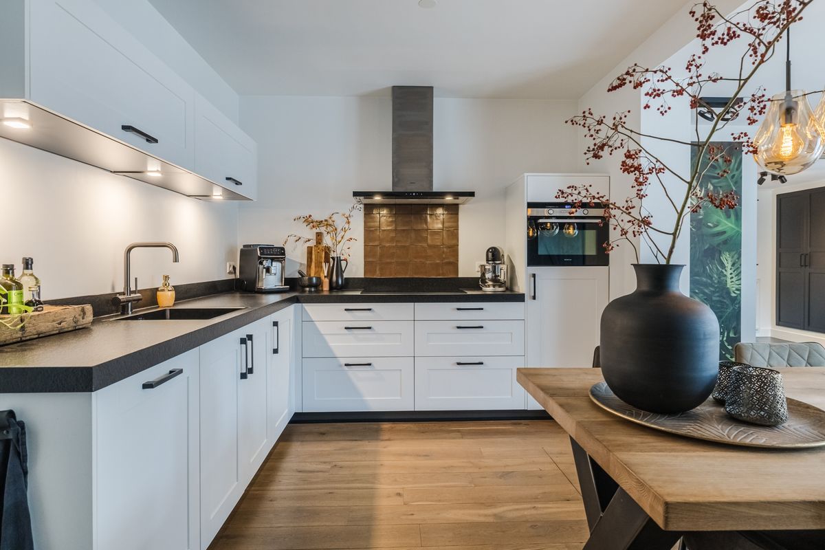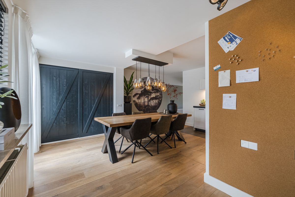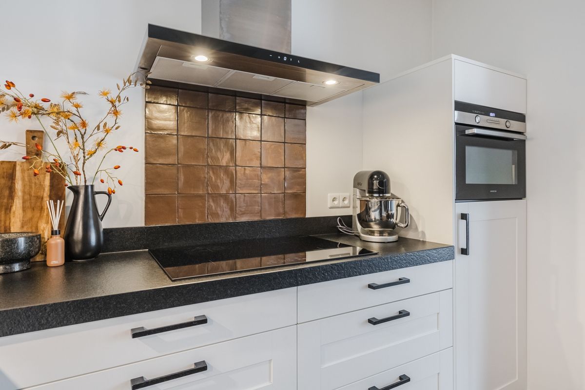 De lichte woonkamer straalt warmte en gezelligheid uit. Aan de achterzijde bevindt zich de uitgebouwde woonkeuken (2020). De moderne keuken is voorzien van luxe inbouwapparatuur, een vaste kastenwand en openslaande deuren naar het terras met sfeervolle overkapping.
