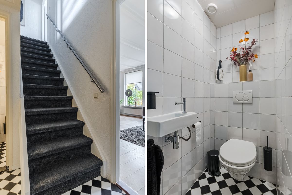 Aangrenzend ligt de praktische, geïsoleerde bijkeuken met ruimte voor wasmachine en droger, en toegang tot de verwarmde garage met carport. Op de verdiepingen bevinden zich vier slaapkamers en een moderne badkamer met vloerverwarming.