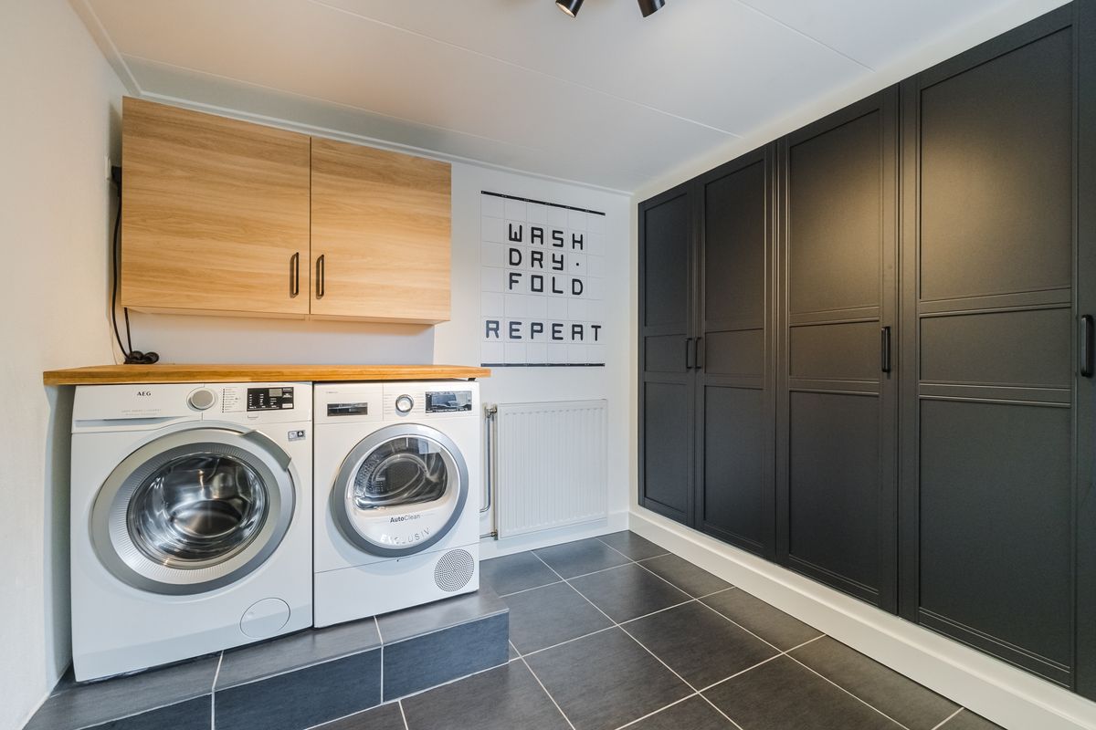 - Praktische bijkeuken met vaste kastenwand en opstelplaats voor wasmachine en droger;