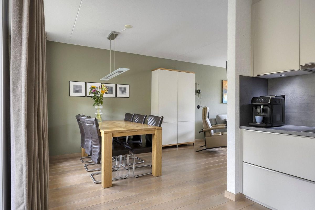De nette ontvangsthal is voorzien van een trapopgang, toiletruimte en biedt toegang tot de woonkamer. Op de begane grond bevindt zich een royale en lichte woonkamer, waarin de grote ramen zorgen voor een aangename sfeer en veel natuurlijke lichtinval. De moderne open keuken sluit hier naadloos op aan en is uitgerust met alle benodigde inbouwapparatuur. De keuken is uitgevoerd in een praktische hoekopstelling en biedt volop bergruimte in de diverse kasten en lades. Vanuit de keuken is er directe toegang tot de sfeervolle overkapping en de fraai aangelegde achtertuin.
