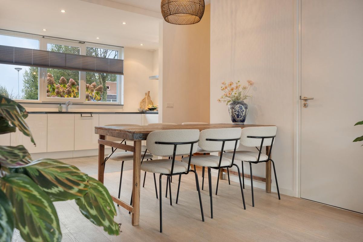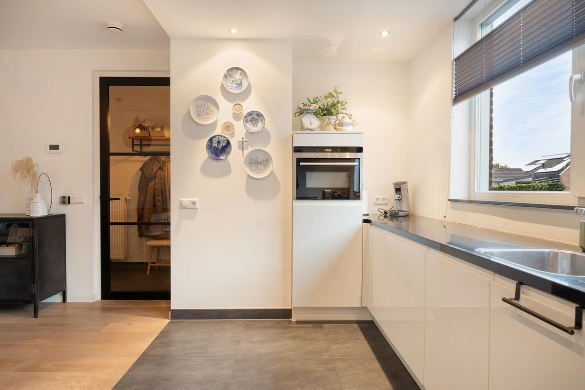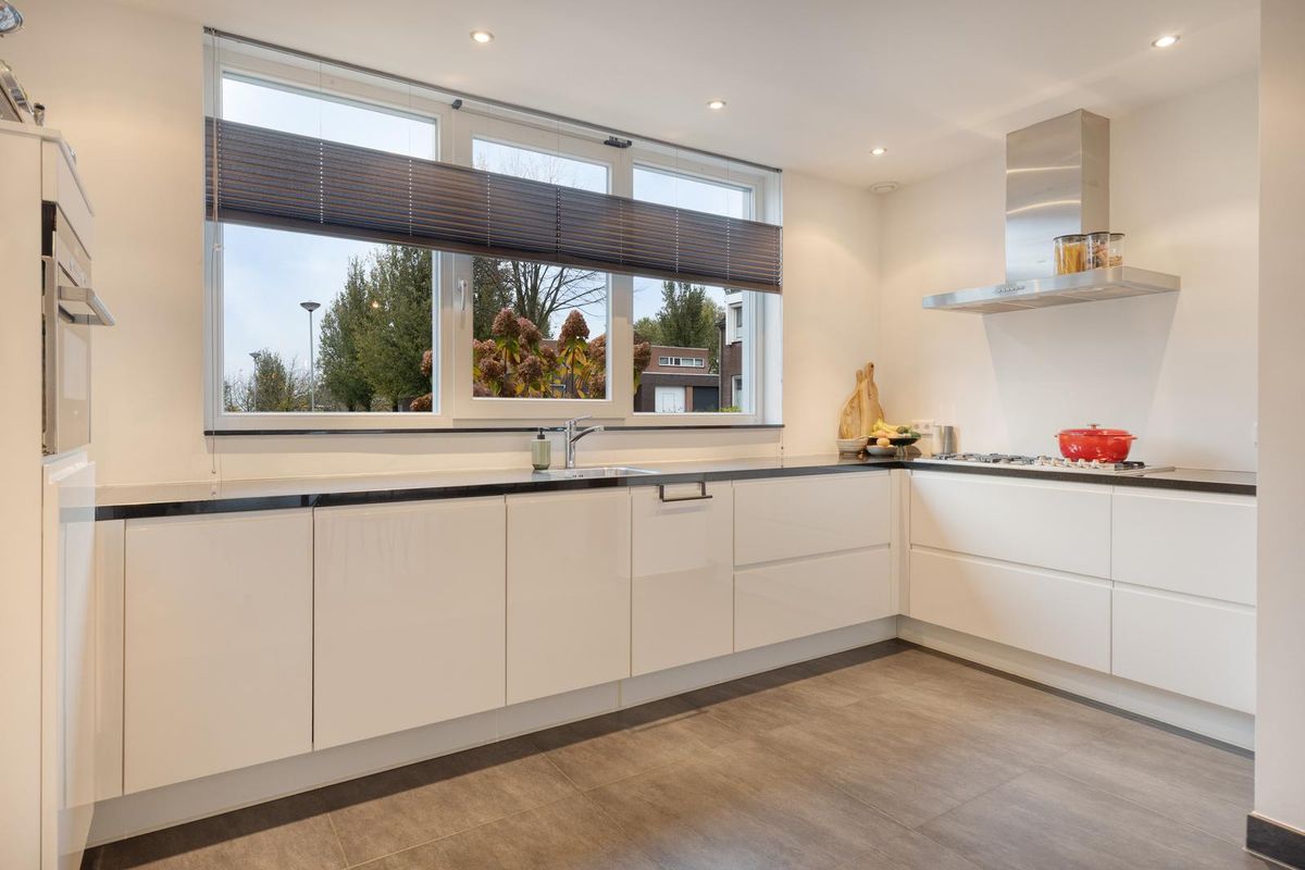 Moderne open keuken (9m²) met vele raampartijen en zicht op de voor/straat-zijde.