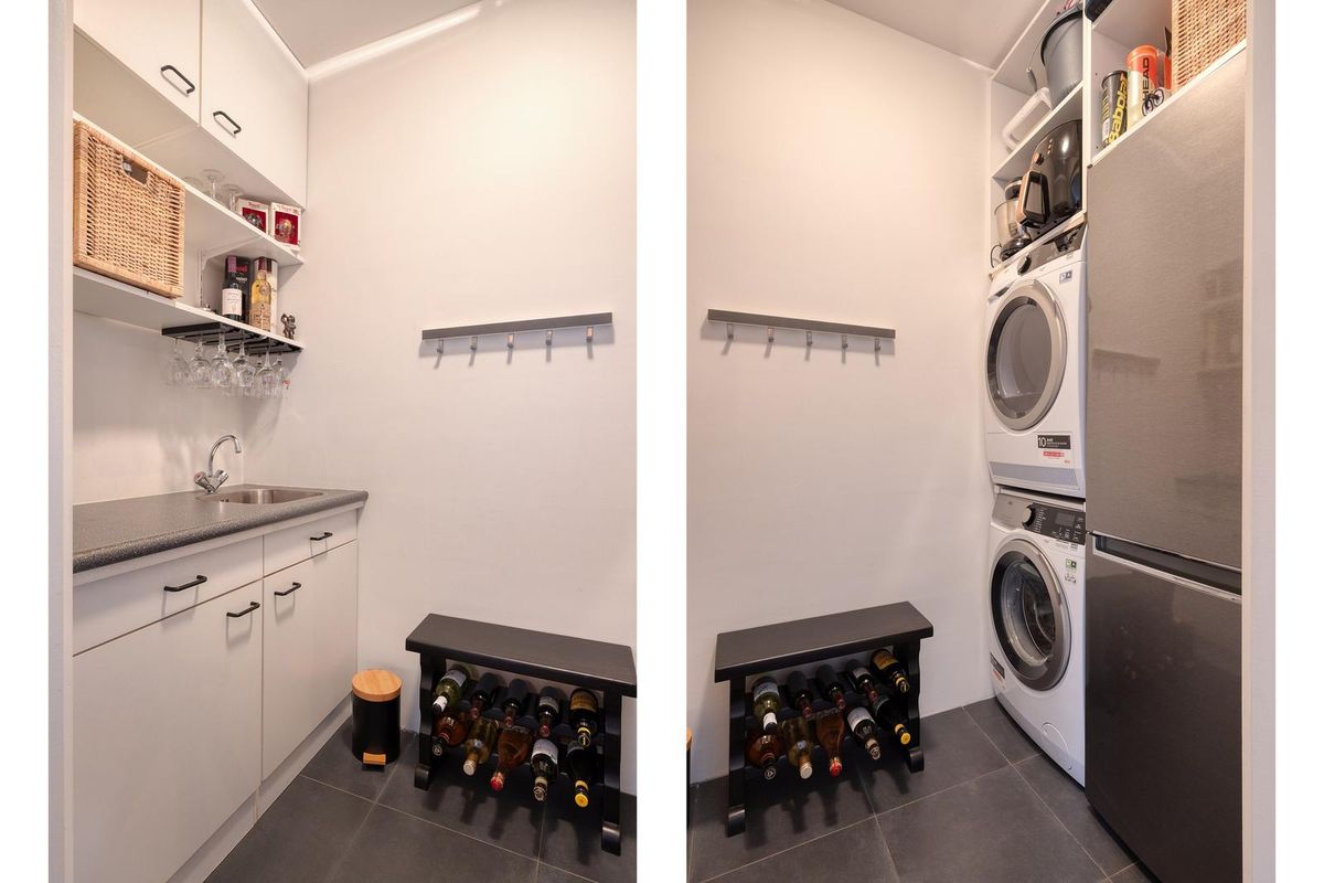 Tevens is de bijkeuken (3m²) naast de woonkamer gesitueerd. Deze ruimte heeft een extra keukenblok en is er