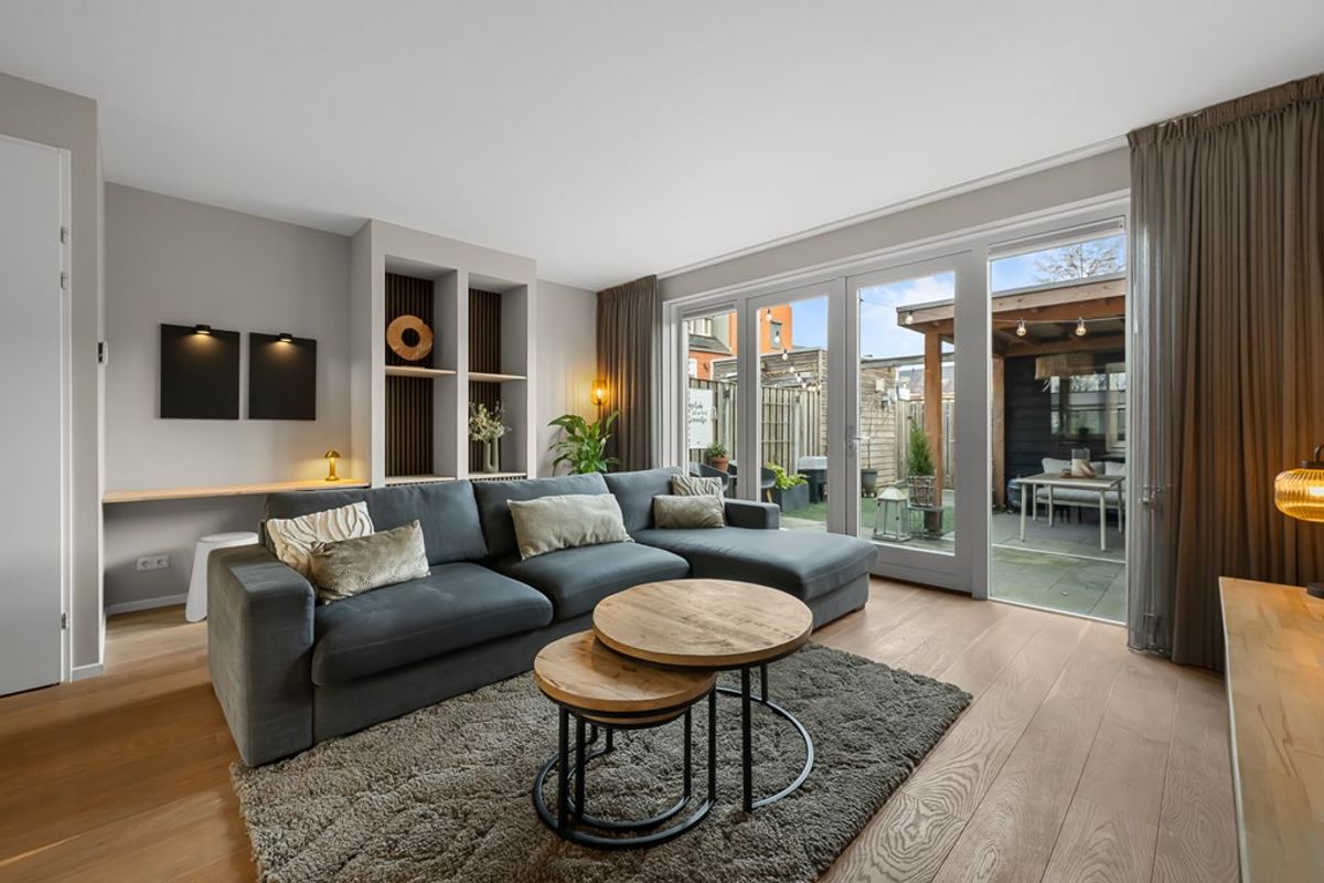 Aan de achterzijde van de woning bevindt zich de comfortabele zithoek, waar openslaande deuren direct toegang geven tot de tuin. Hierdoor lopen binnen en buiten mooi in elkaar over, ideaal op zonnige dagen. De achtertuin is verzorgd aangelegd, gelegen op het noorden en voorzien van een overkapping en een berging. De tuin grenst aan het parkeerterrein van de wijk, wat zorgt voor extra gemak.
