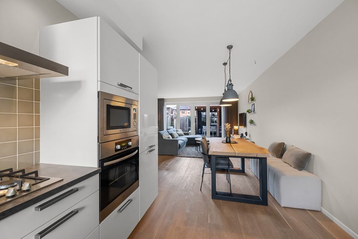Via de entree kom je in de lichte en sfeervolle woonruimte. Aan de voorzijde bevindt zich de moderne keuken in hoekopstelling, compleet uitgerust met diverse inbouwapparatuur waaronder koel/vries combinatie, combi magnetron, oven, 5 pits gasfornuis en afzuigkap. Een fijne plek om te koken, met prettig lichtinval en uitzicht op het groen en water aan de voorzijde.