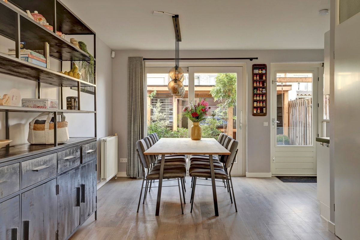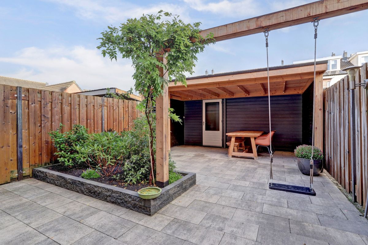 Vanuit de woonkeuken stap je zo de fraai aangelegde achtertuin in. Hier geniet je van het groen en de fijne overkapping, waardoor je ook ’s avonds of bij regen lekker buiten kunt zitten.