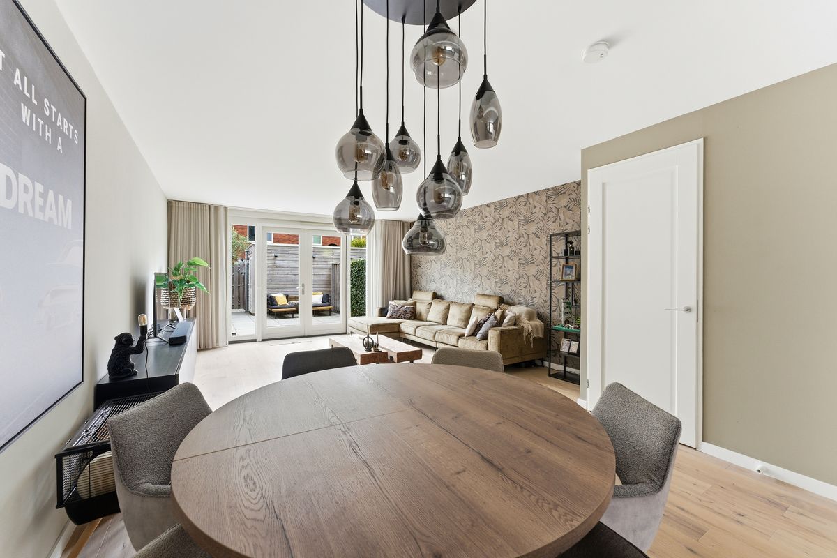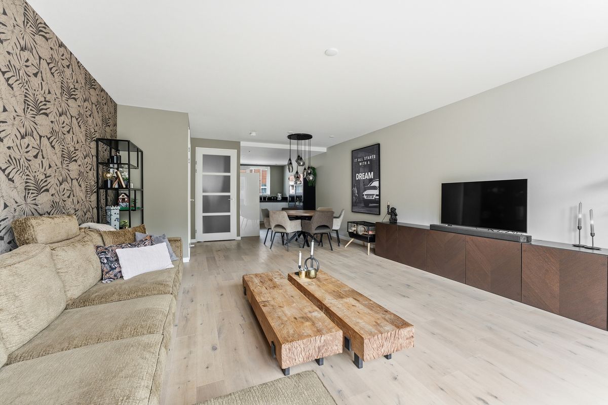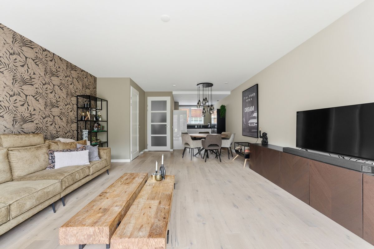 Woonkamer: De begane grond is tijdens de bouw uitgebouwd, waardoor er een heerlijke, ruime woonkamer is ontstaan. Dankzij de openslaande deuren naar de tuin geniet je van veel licht en een prettige verbinding met buiten. De handige trapkast zorgt voor extra opbergruimte. Er is hier genoeg plek voor een gezellige zithoek en een eethoek richting de voorzijde van de woning. De ruimte is keurig afgewerkt met een parketvloer, wanden met (glasvlies)behang en een gestuukt plafond.