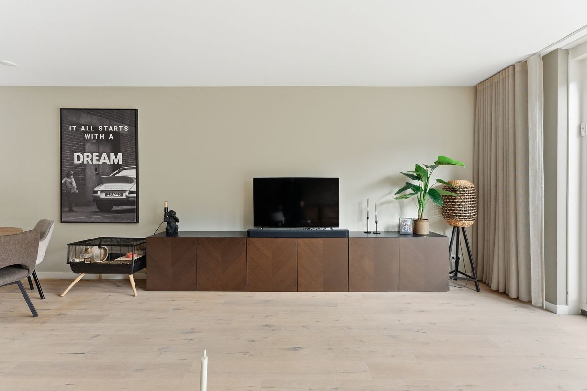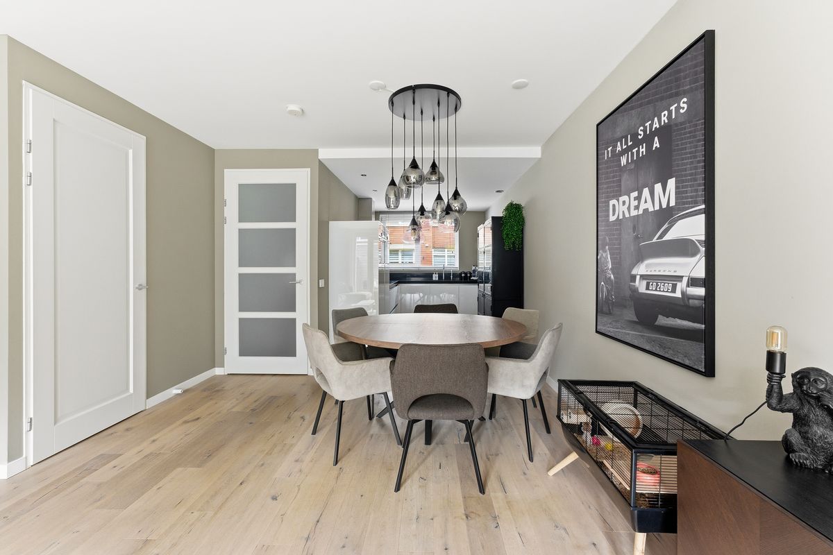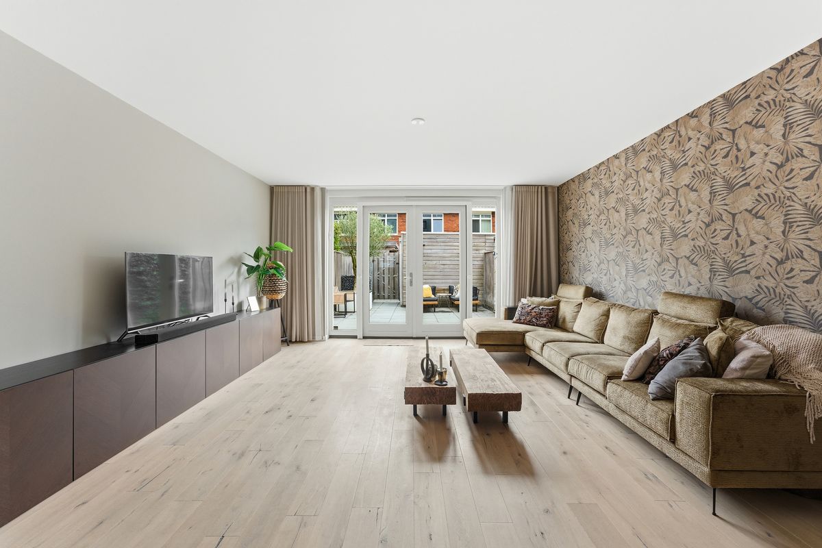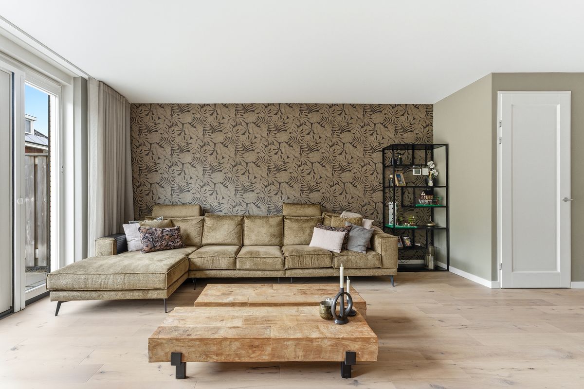 Woonkamer: De begane grond is tijdens de bouw uitgebouwd, waardoor er een heerlijke, ruime woonkamer is ontstaan. Dankzij de openslaande deuren naar de tuin geniet je van veel licht en een prettige verbinding met buiten. De handige trapkast zorgt voor extra opbergruimte. Er is hier genoeg plek voor een gezellige zithoek en een eethoek richting de voorzijde van de woning. De ruimte is keurig afgewerkt met een parketvloer, wanden met (glasvlies)behang en een gestuukt plafond.
