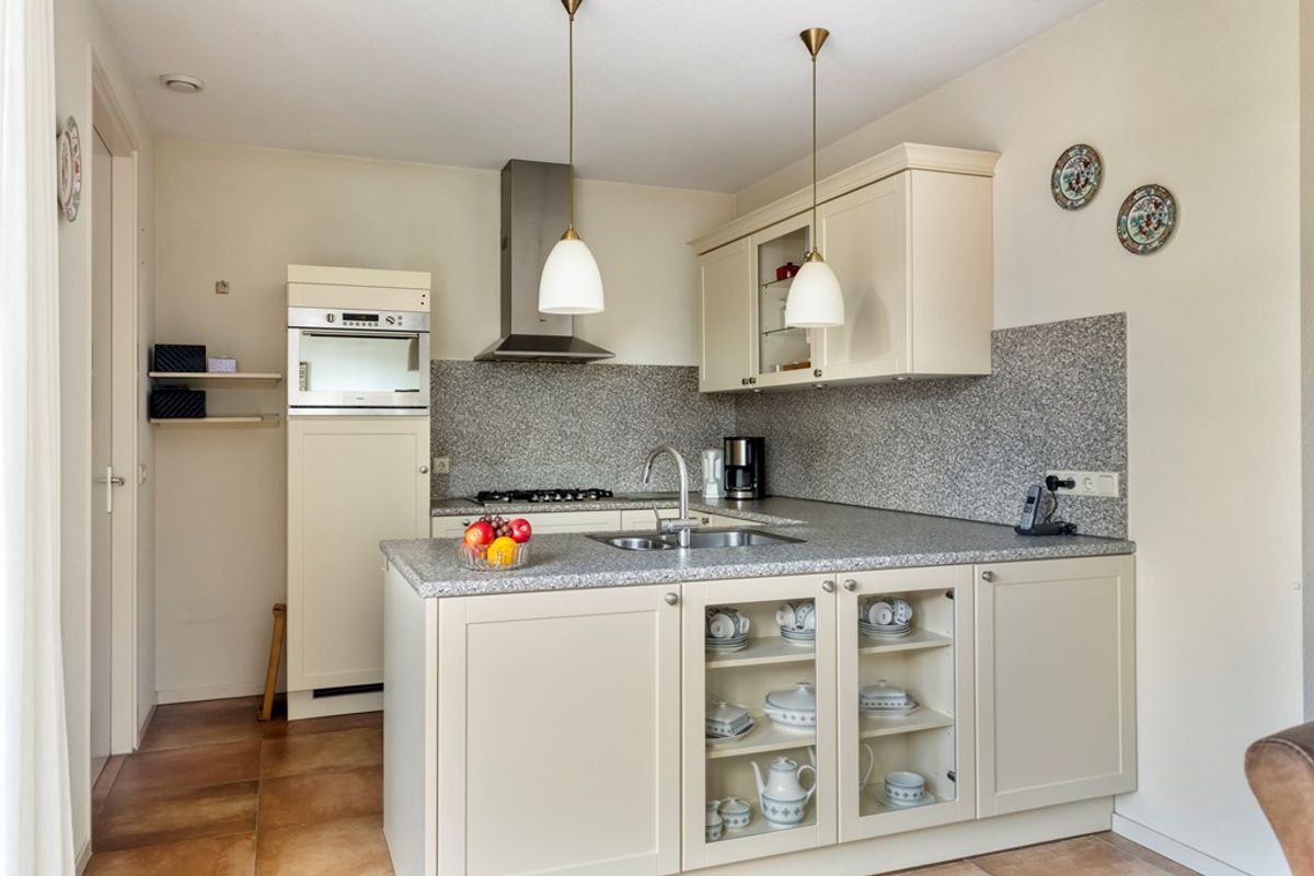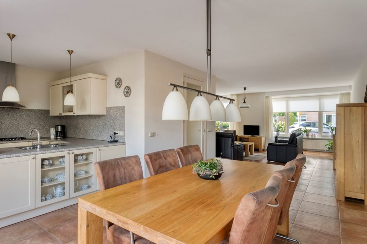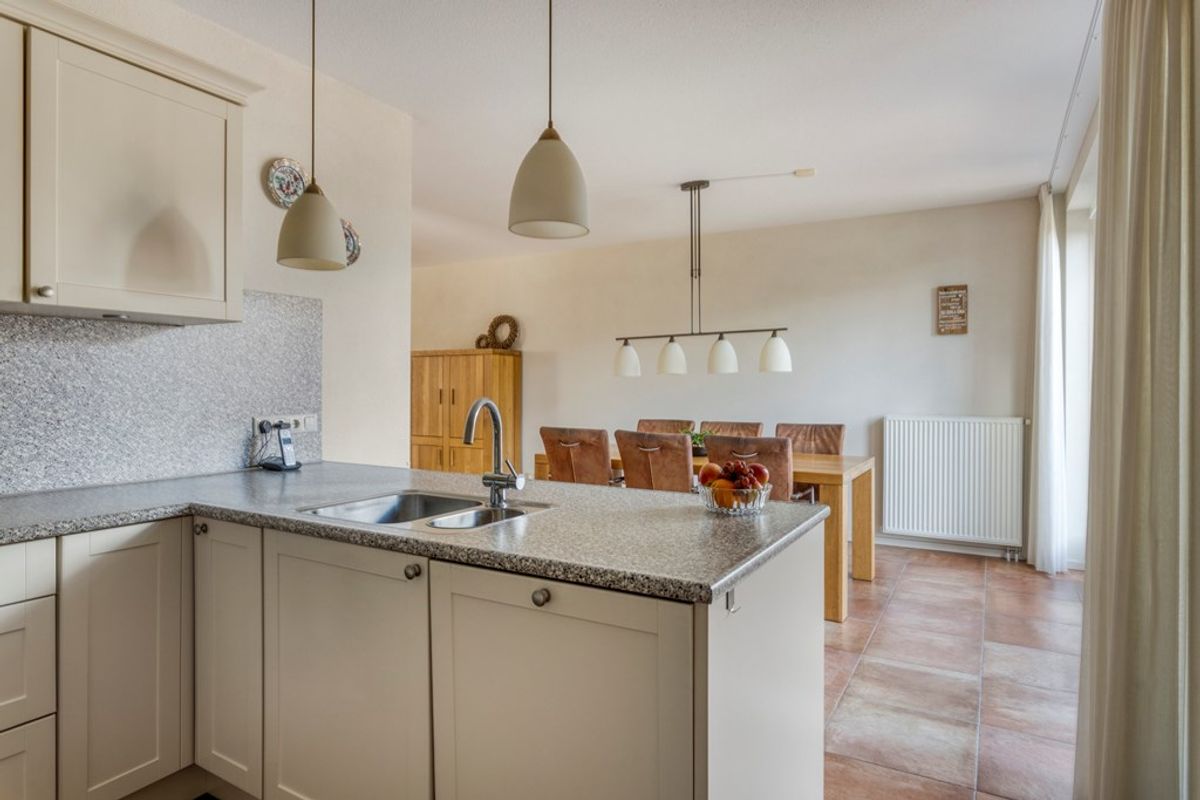 Via de royale oprit bereikt u de entree van de woning. In de ruime hal treft u de meterkast, trapopgang en een modern toilet. De woonkamer strekt zich uit over de volledige breedte van de woning en wordt overspoeld door licht dankzij de grote raampartijen aan de voorzijde en de openslaande tuindeuren aan de achterzijde. Een heerlijke ruimte waar een sfeervolle zithoek eenvoudig wordt gecreëerd. De woonkamer sluit naadloos aan op de open leef keuken. Deze ruime keuken is ingericht met een licht U-meubel en voorzien van diverse apparatuur, zoals een gaskookplaat, afzuigkap, combi-oven, koelkast en een vaatwasser. Aangrenzend vindt u de bijkeuken, welke is voorzien van een spoelmeubel en toegang verleend aan zowel de achtertuin als de garage.