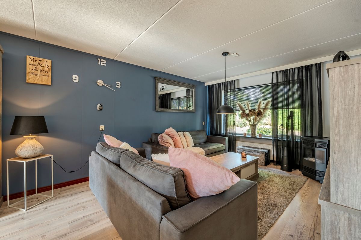 - Woonkamer met pellet kachel en laminaat vloer en harmonicadeuren met hor naar overkapping/achtertuin