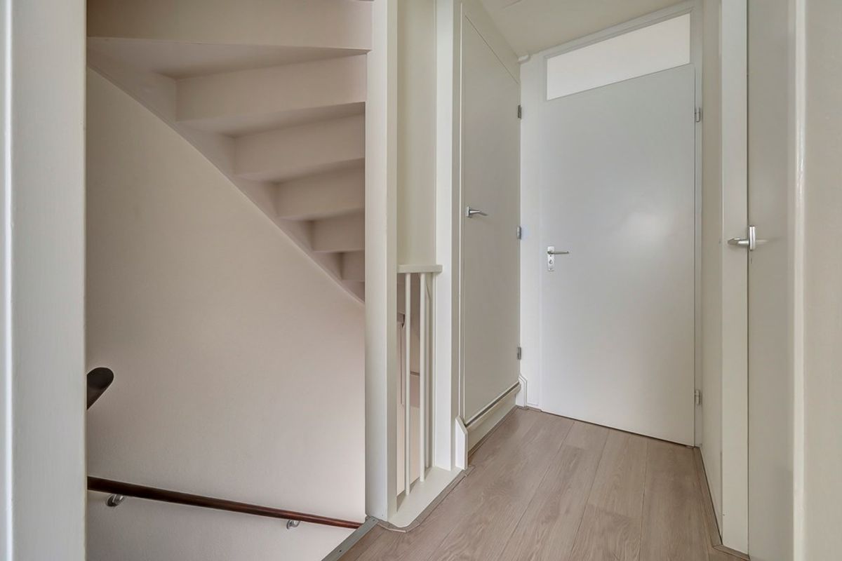 Entree/hal (voorzien van tegelvloer), meterkast, toiletruimte (staand toilet en fonteintje), woonkamer (voorzien van laminaat, gestucte wanden, spuitwerk plafond en trapkast), open keuken (voorzien van diverse inbouwapparatuur, met o.a. inductie kookplaat, combi-magnetron en vaatwasser).