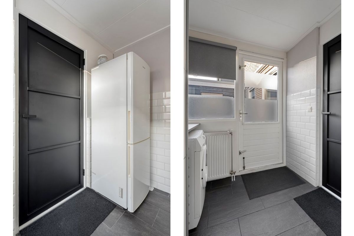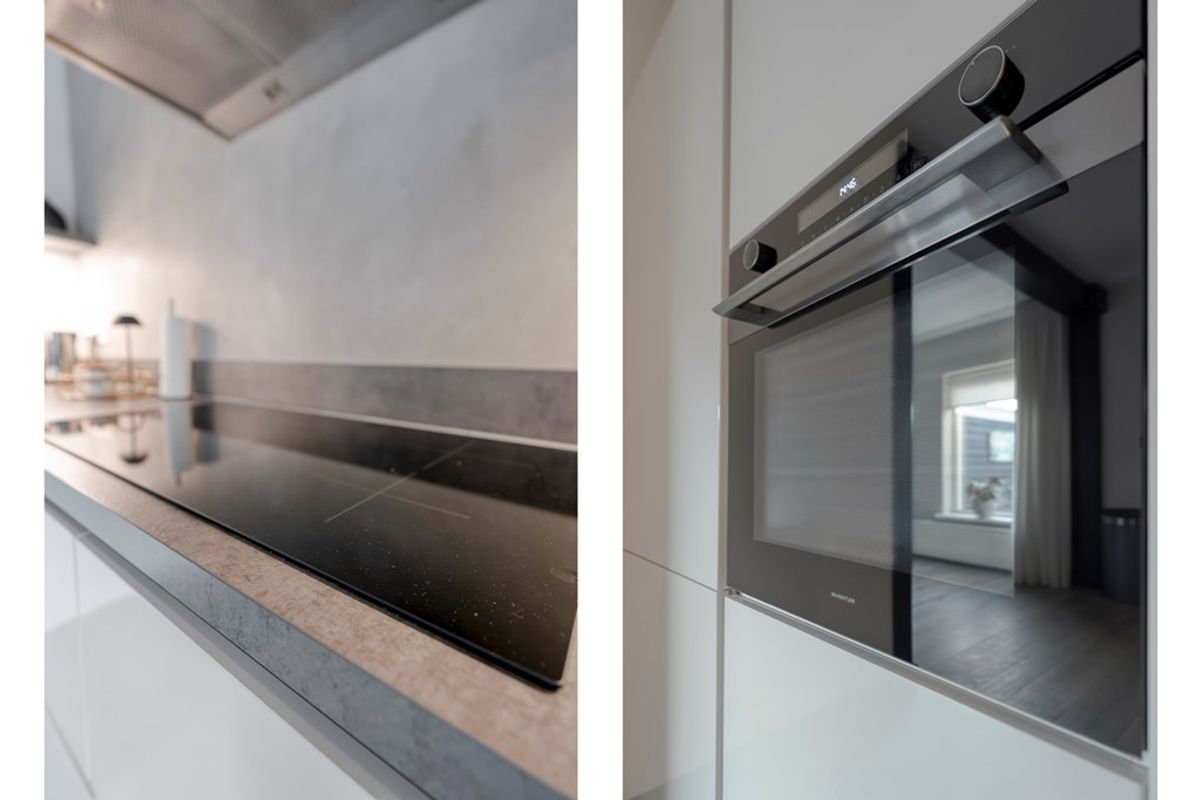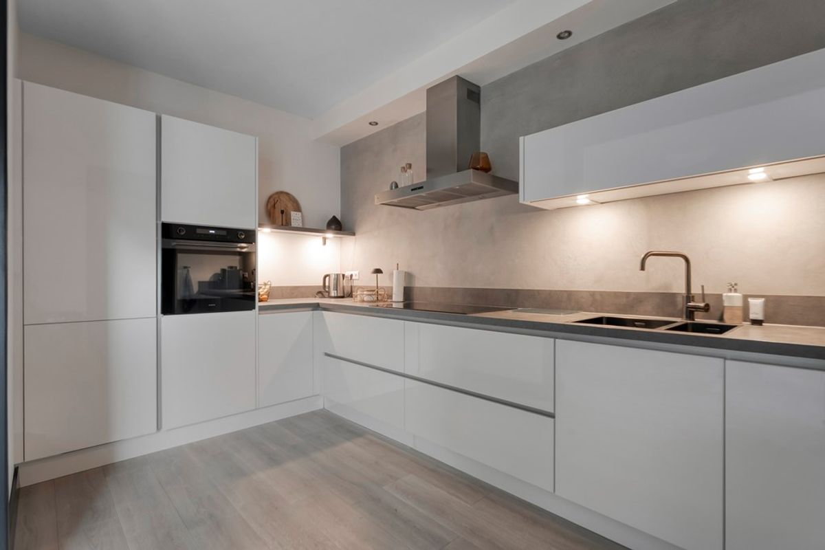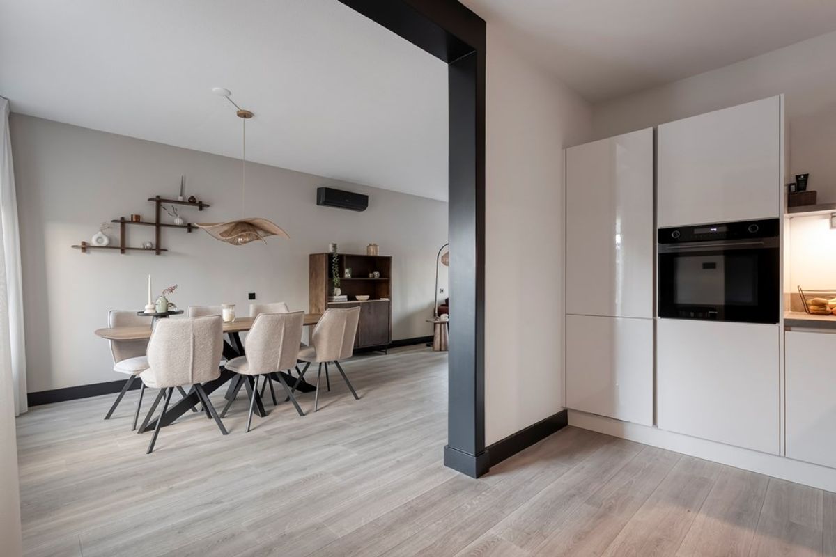 Hal/entree met meterkast, trapkast en het toilet; Ruime woonkamer; Moderne halfopen keuken (2020) voorzien van een inductie kookplaat, afzuigkap, vaatwasser, combi-magnetron en een koel-/vriescombinatie; Praktische bijkeuken.