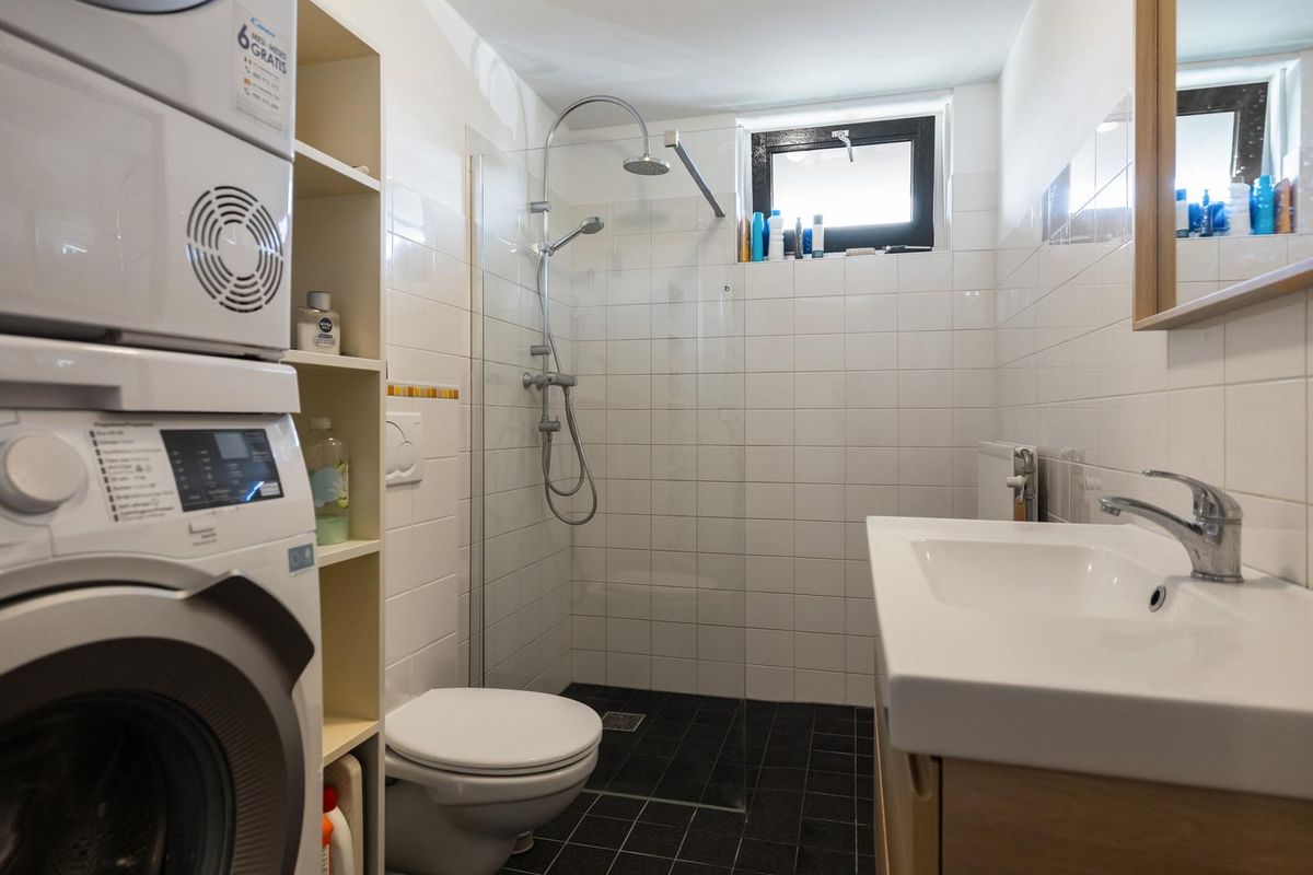 Overloop, toegang tot 3 slaapkamers en een badkamer. De badkamer heeft een wastafelmeubel, een extra wandkast, een inloopdouche, een tweede zwevend toilet en een aansluiting voor de wasmachine. De ruimte heeft zowel natuurlijke als mechanische ventilatie.