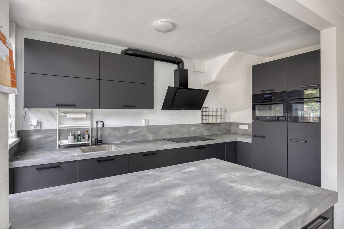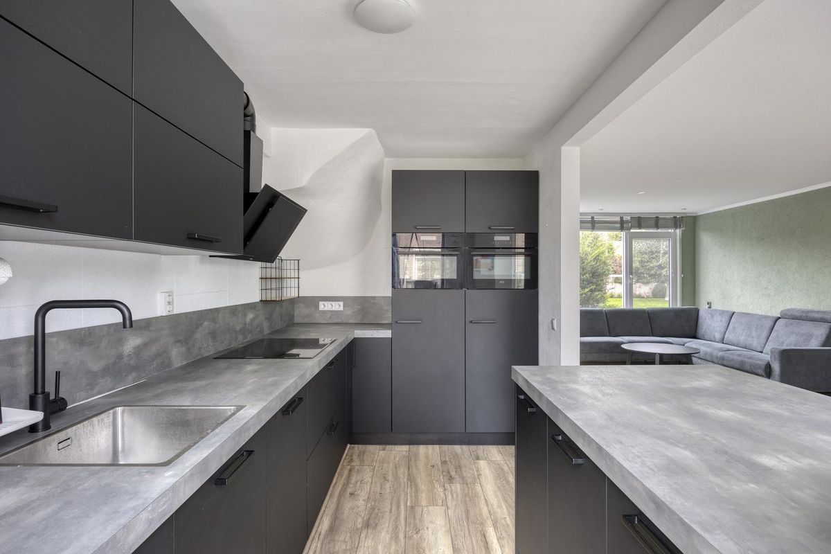 * Moderne woonkeuken voorzien van laminaat vloer, elektrische kookplaat, afzuigkap, 2x combi-oven/combimagnetron, koelkast, vriezer, vaatwasmachine en deur naar de zonnige achtertuin.