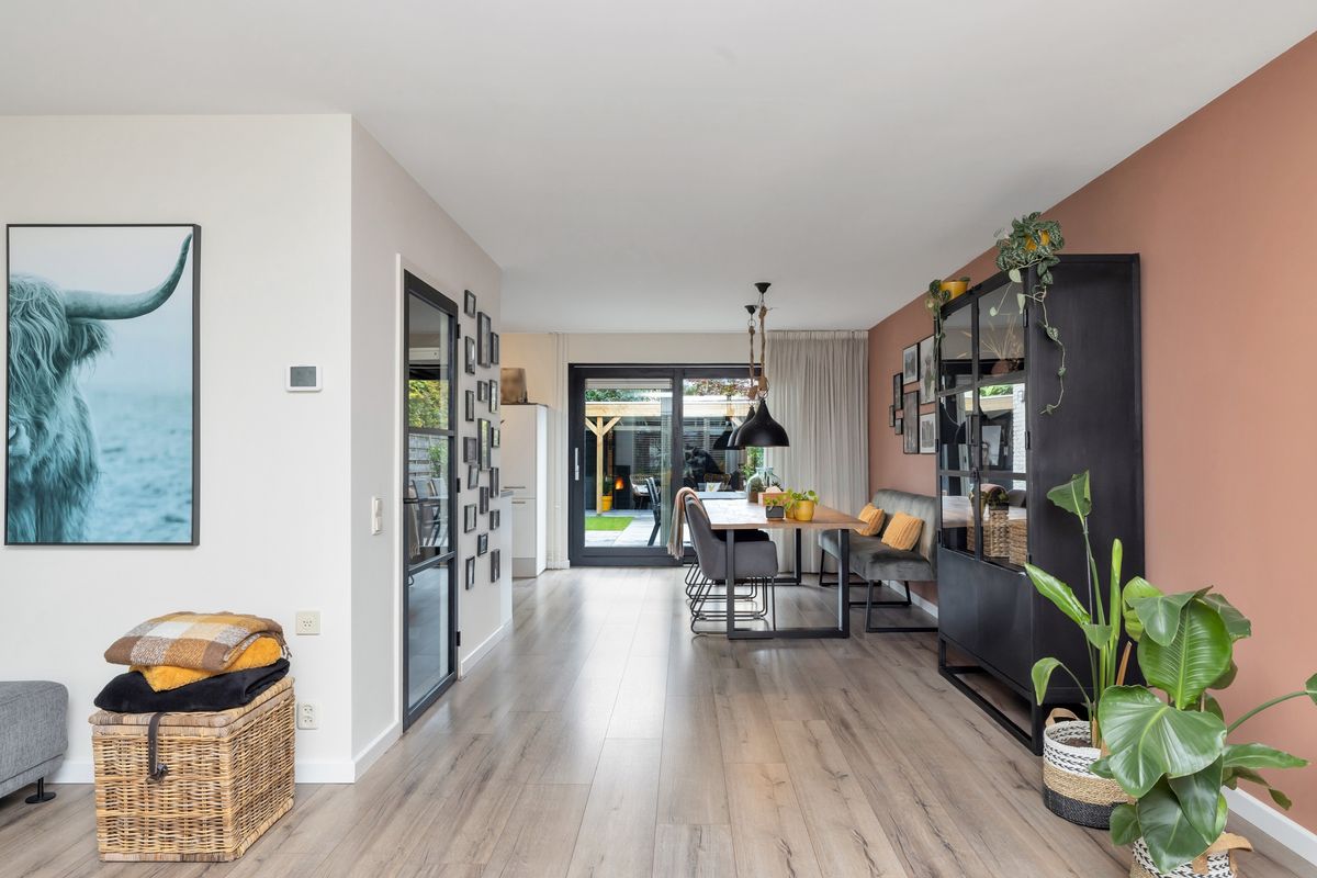 Via de entree met hal, meterkast en trapopgang kom je binnen in de lichte, ruime woonkamer. Dankzij de grote ramen valt direct de fijne lichtinval op. De wanden en plafonds zijn strak afgewerkt en geven de ruimte een moderne uitstraling. De gehele beneden verdieping is voorzien van een moderne laminaatvloer met vloerverwarming.