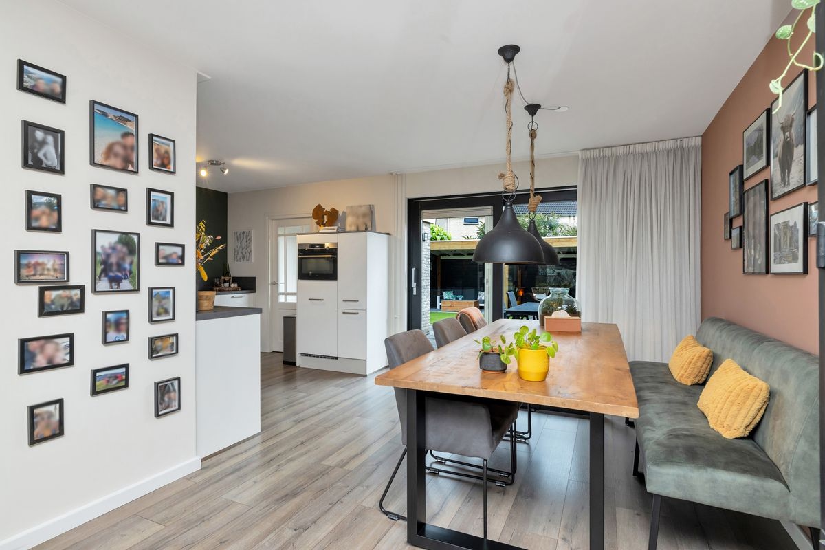 Aan de achterzijde bevindt zich de eethoek met aangrenzende lichte keuken in U-opstelling, voorzien van alle gemakken: een vaatwasser, inductiekookplaat, rvs-afzuigkap, combi-oven en koel-/vriescombinatie.