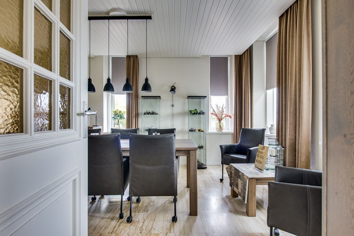 Aan de achterzijde van de woning ligt een zitkamer met openslaande deuren naar het terras en uitzicht over de diepe tuin. Hier ervaar je rust, ruimte en het echte buitenleven.