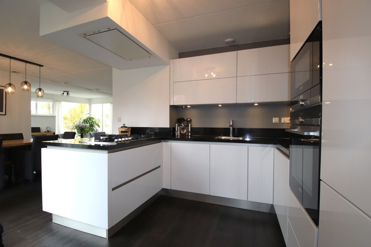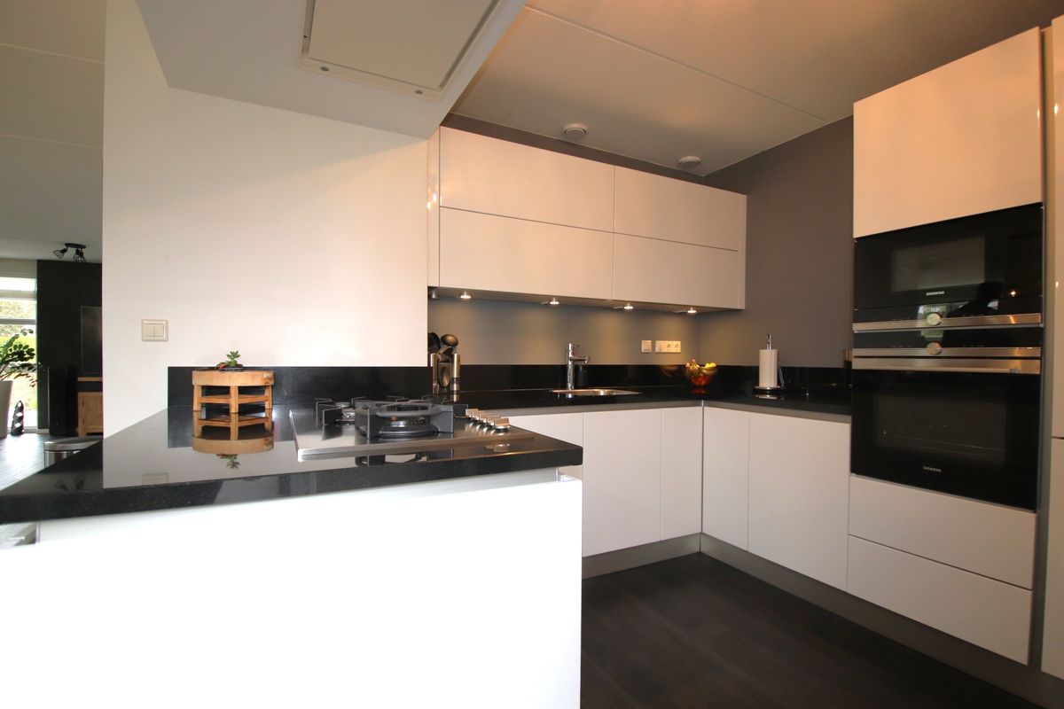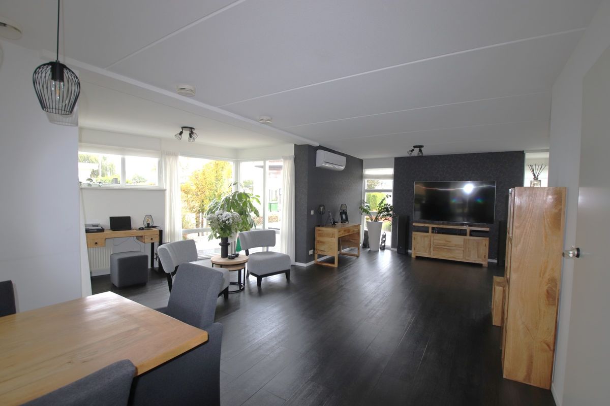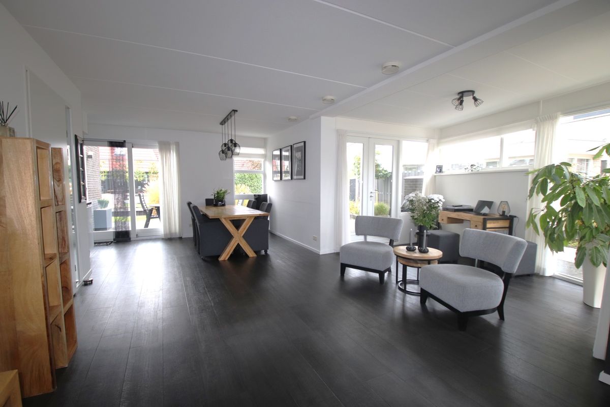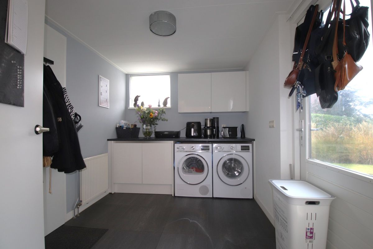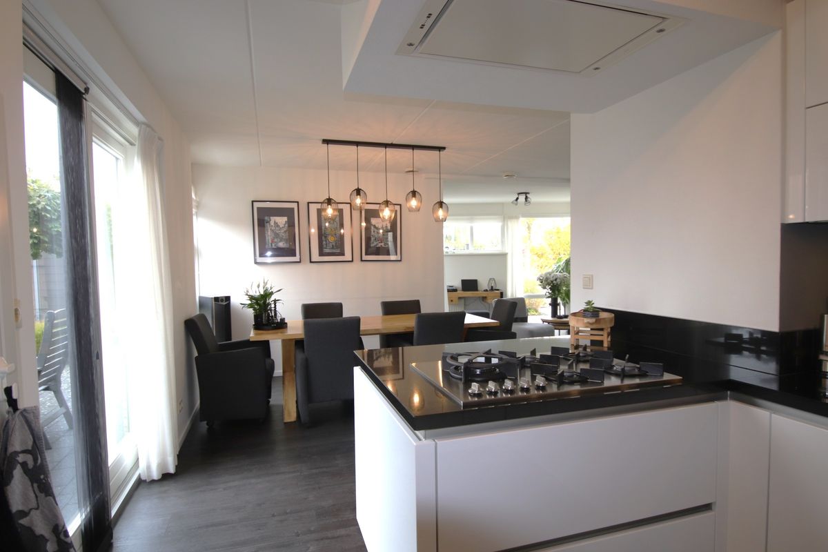 entree, hal, hardhouten trapopgang, modern toilet met fonteintje, royale (70 m²) vormige woonkamer met schuifpui, serre met openslaande tuindeuren naar overkapping, open recente keuken met alle gewenste inbouwapparatuur o.a. koelkast, vriezer, 5-pits gaskookplaat met wokbrander, magnetron, oven, vaatwasser en afzuigkap - allen Siemens, uitpandige bijkeuken met verlengstuk voor keuken met extra keukenkastjes ( voor extra huishoudelijke opslag ), extra werkblad, raampartij voor extra lichtinval en tuindeur, garage voorzien van elektrisch bedienbare garagedeur, betonvloer en raampartij voor lichtinval, vrij achterom, tuin op het zuiden met zonneterras met overkapping aan het water, aanlegsteiger/plaats en botenhellling, vernieuwde onderhoudsvriendelijke voor -en zijtuin, oprit voor 3 auto's met autolader.