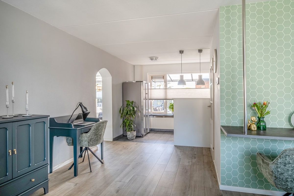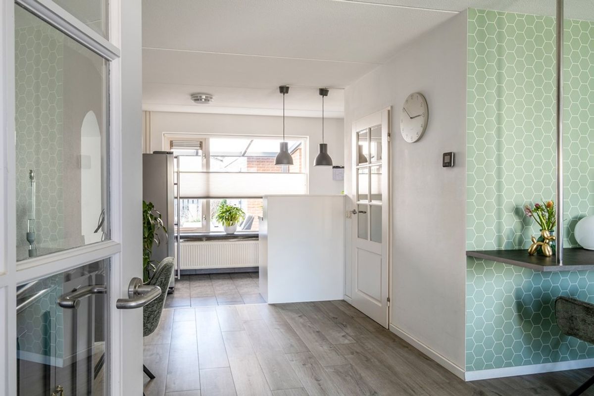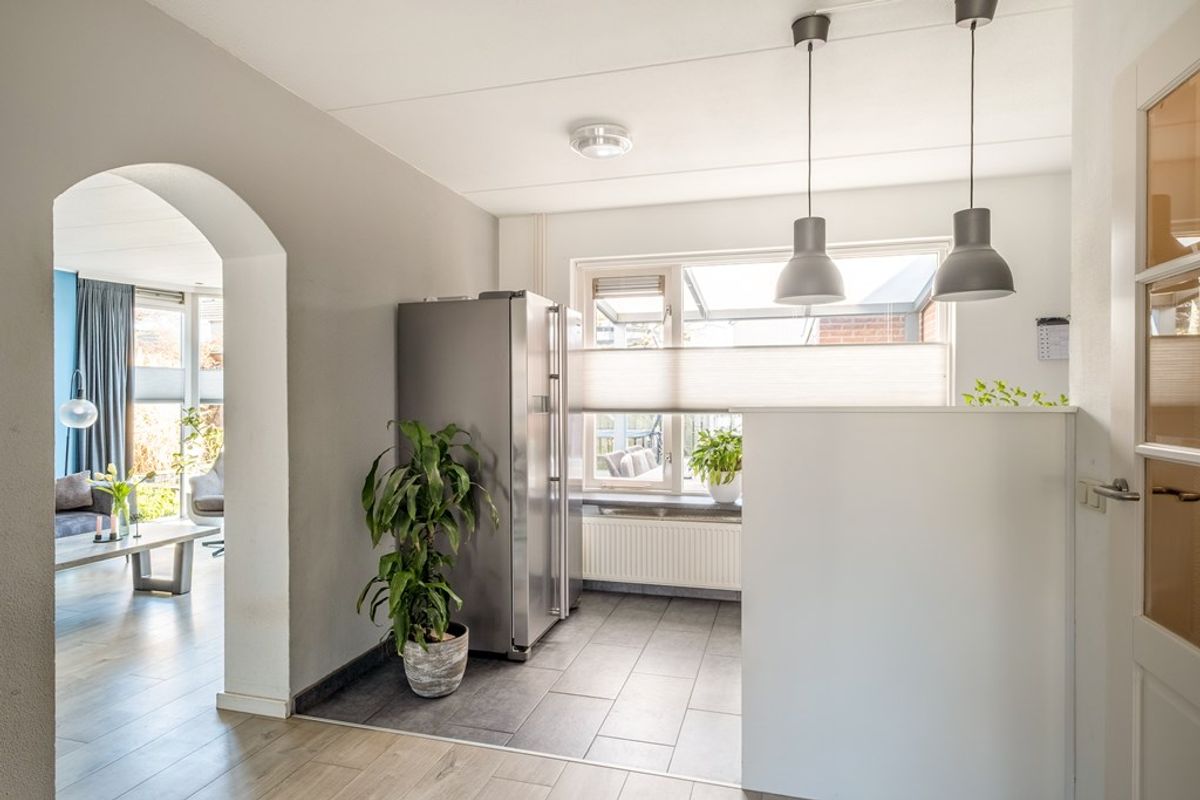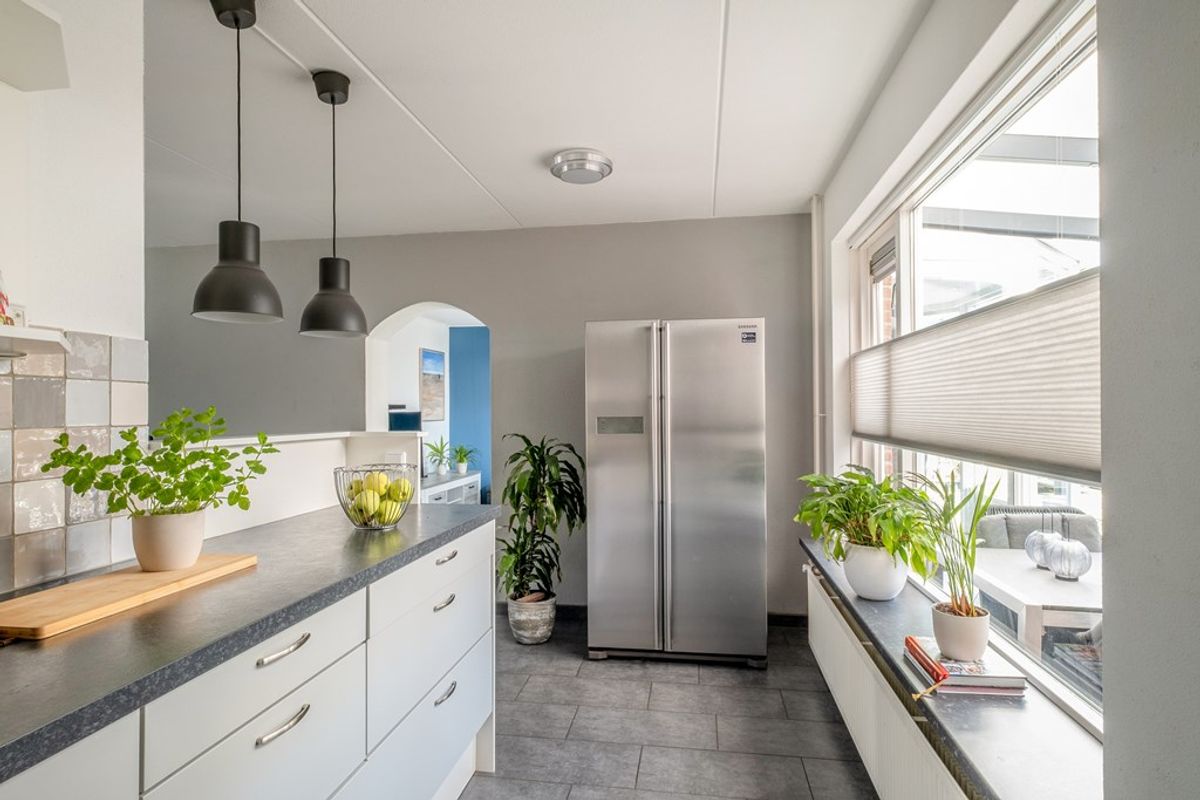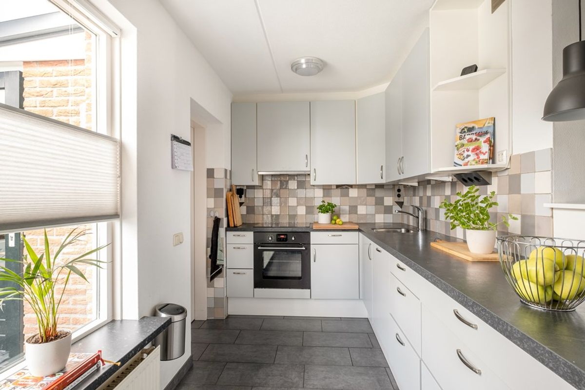 De keuken met inbouwapparatuur staat in open verbinding met de woonkamer en biedt voldoende werk- en kastruimte. Daarnaast is de woning praktisch ingedeeld met extra bergruimte en de mogelijkheid voor wassen en drogen op de begane grond. Alles is doordacht en functioneel ingericht, wat het dagelijks wonen hier extra comfortabel maakt.