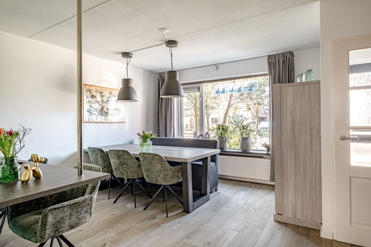 Wanneer je deze woning binnenkomt, ervaar je direct een verrassende zee van ruimte. Via de hal kom je in de ruime eetkamer aan de voorzijde van de woning. Deze ruimte staat in directe verbinding met de keuken en de mooie lichte erker aan de achterzijde van de woning. Hier is een heerlijke plek gecreëerd om te genieten van de warmte van de gezellige gaskachel in de winter en een fijne lichte plek om te zitten tijdens de zonnige dagen. Dankzij de grote raampartijen valt het daglicht hier rijkelijk naar binnen en ontstaat een warme en uitnodigende sfeer.