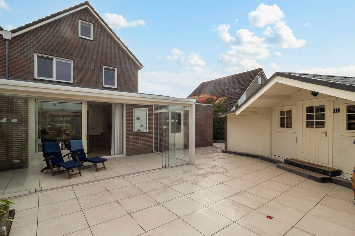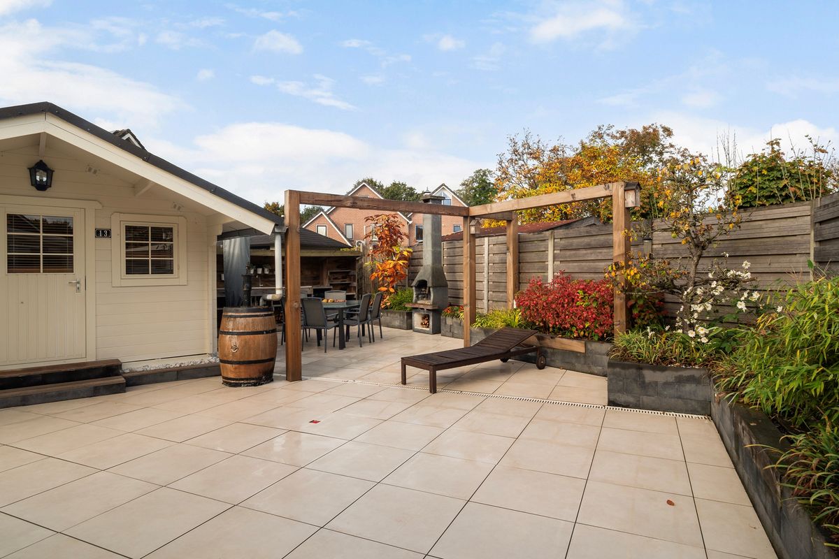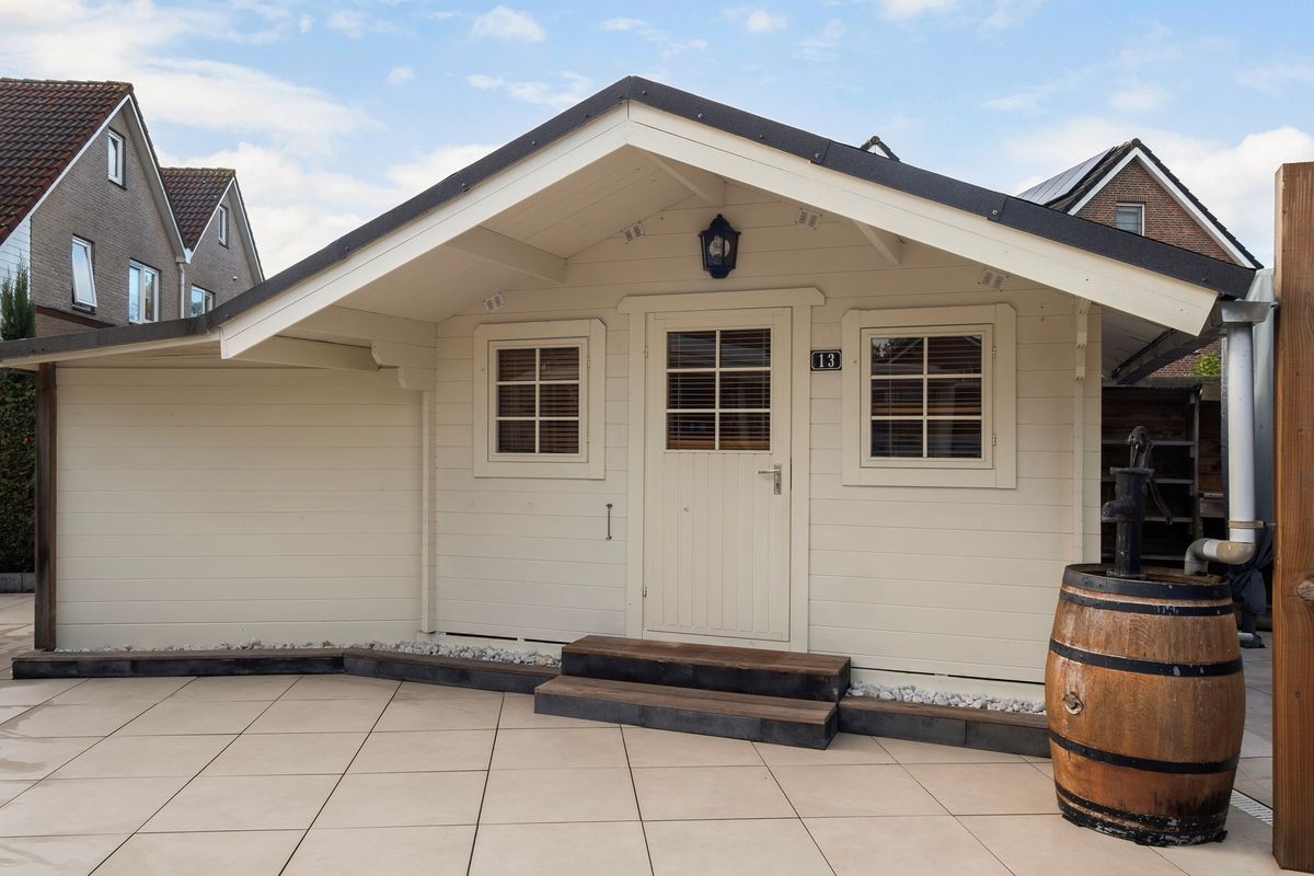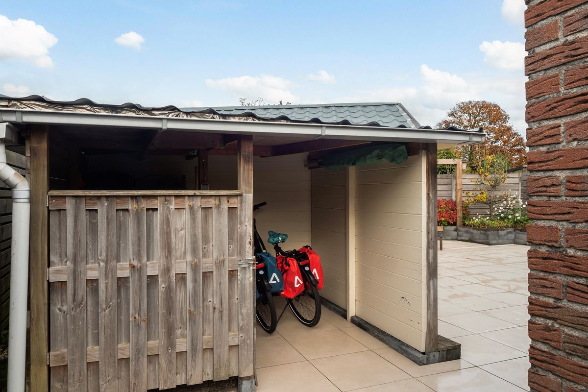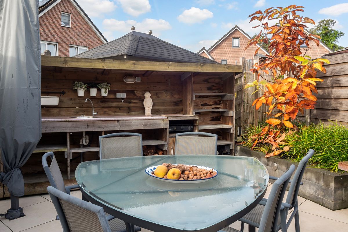 Buiten: Over de buitenruimte valt veel te vertellen. Er is een nette voortuin met daarnaast een oprit en carport die plaats bieden aan maar liefst vier auto’s. De prachtige achtertuin bereikt u vanuit de garage, de serre of een achterom naast de garage. De fraaie, onderhoudsvriendelijke achtertuin, ontworpen door een tuinarchitect, beschikt over een buitenkeuken, een stenen barbecue en sfeervolle tuinverlichting. Er is een beregeningssysteem met een timer en eigen waterbron en een fietsenhok met separate motorstalling. Ook bevindt zich in de tuin een atelier/praktijkruimte met een eigen keukentje. Het atelier is goed geïsoleerd waardoor het er ook in de winter goed toeven is.
