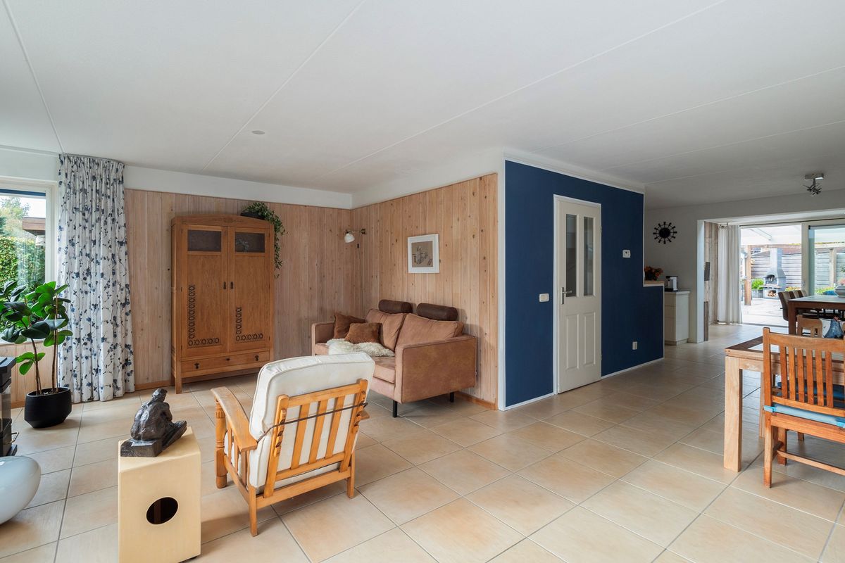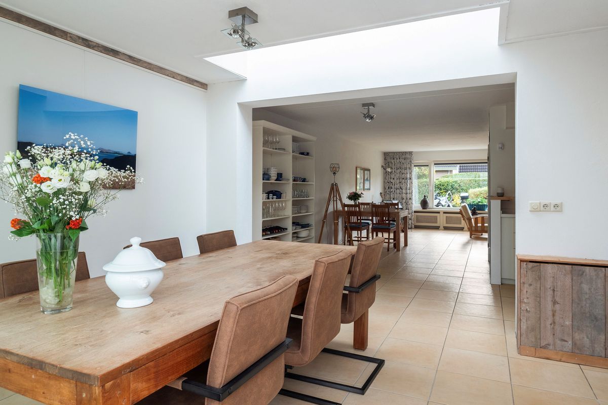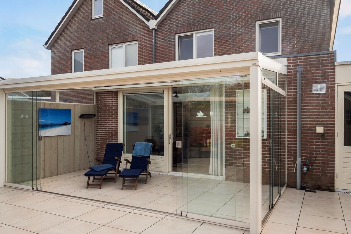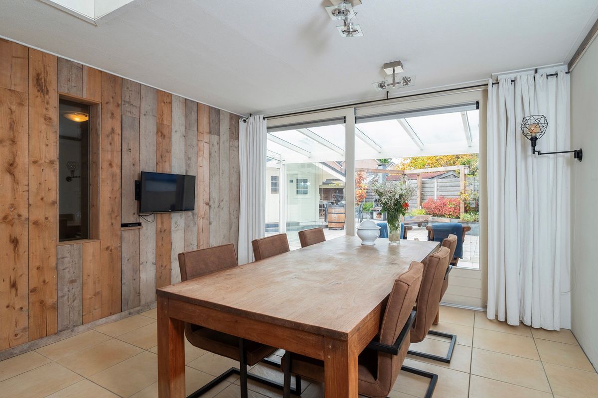 Aan de achterzijde van de woning is in een uitbouw een gezellige eethoek gerealiseerd met daarachter nog een zonnige tuinkamer/serre, met van daaruit toegang tot de tuin door middel van grote glazen schuifdeuren. Deze serre beschikt over met een afstandsbediening bedienbare zonwering en verlichting (via wifi).
