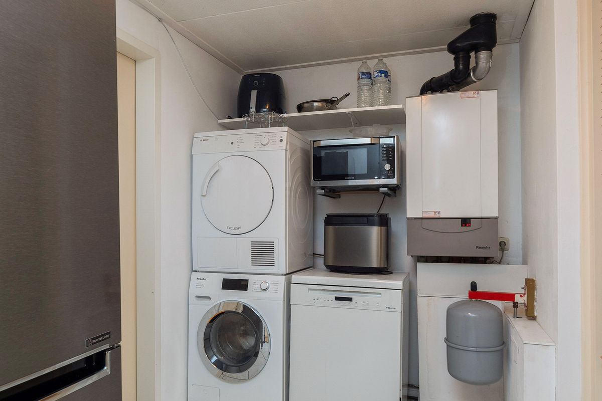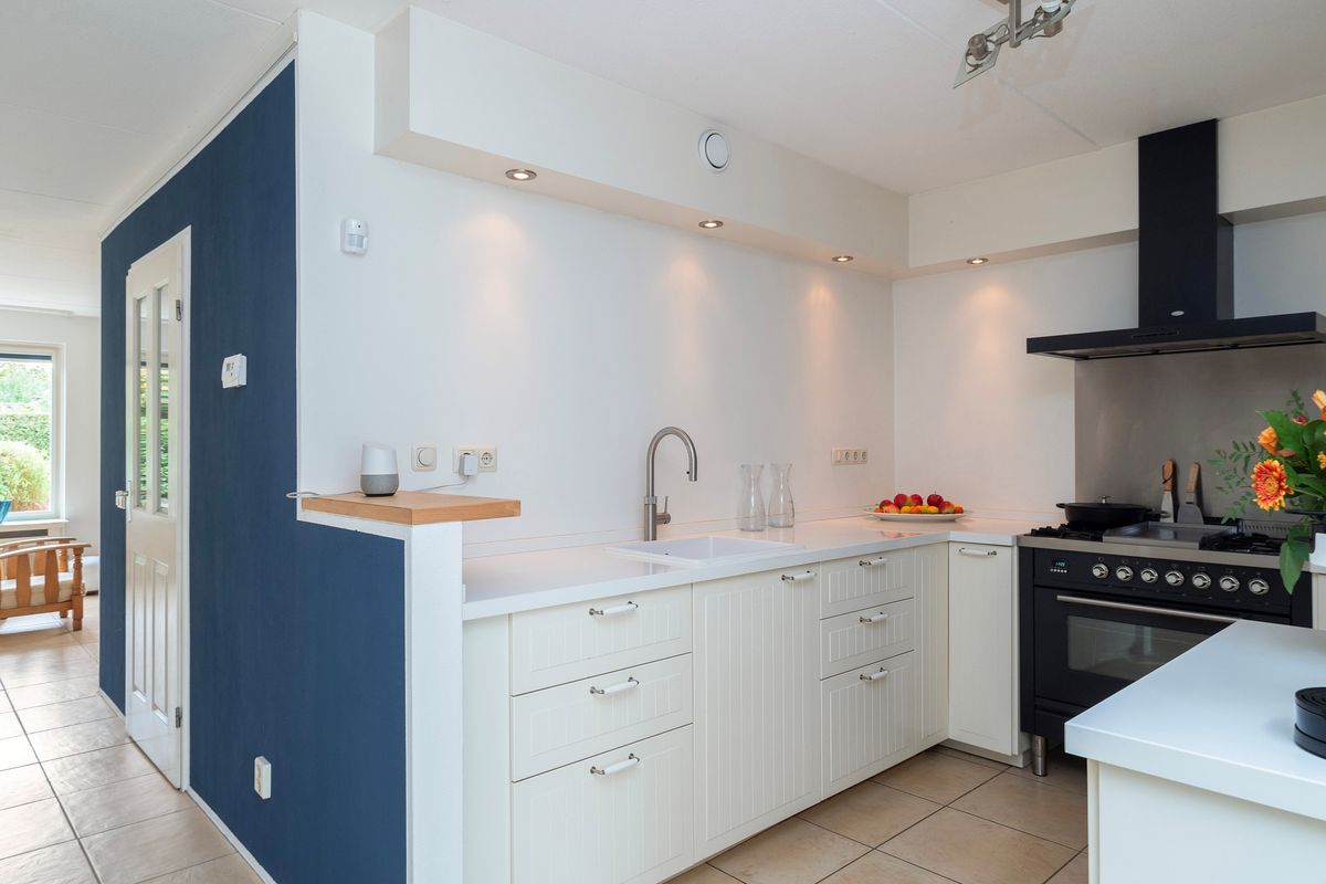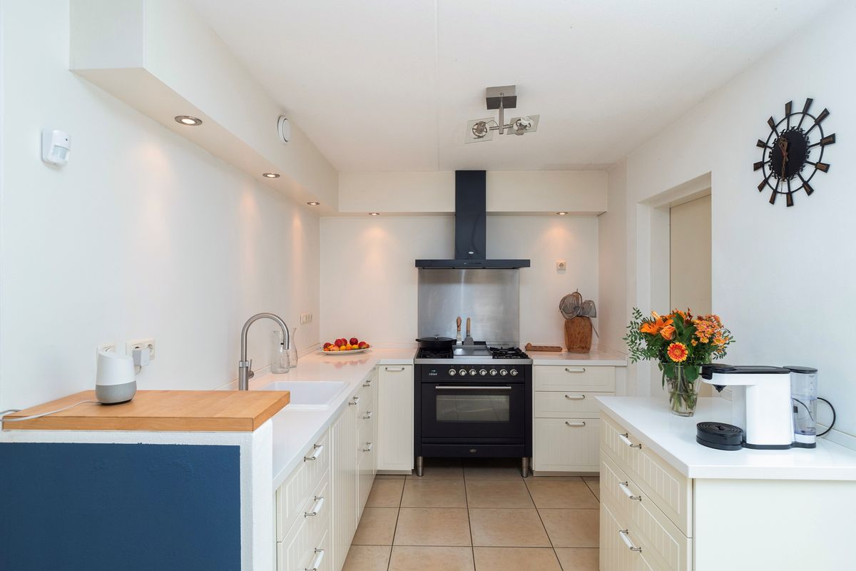 De open keuken in L-opstelling is voorzien van onder meer een Boretti vierpits gascomfort met extra frytop, een oven op krachtstroom en een Qooker. De keuken biedt verder toegang tot een bijkeuken met wasmachine-opstelling en plek voor veel extra keukenapparatuur, zoals bijvoorbeeld een vaatwasser. Vanuit de bijkeuken leidt een deur naar de geïsoleerde garage met elektrisch bedienbare deur. Voor de echte klusser beschikt de garage verder over een krachtstroomaansluiting.