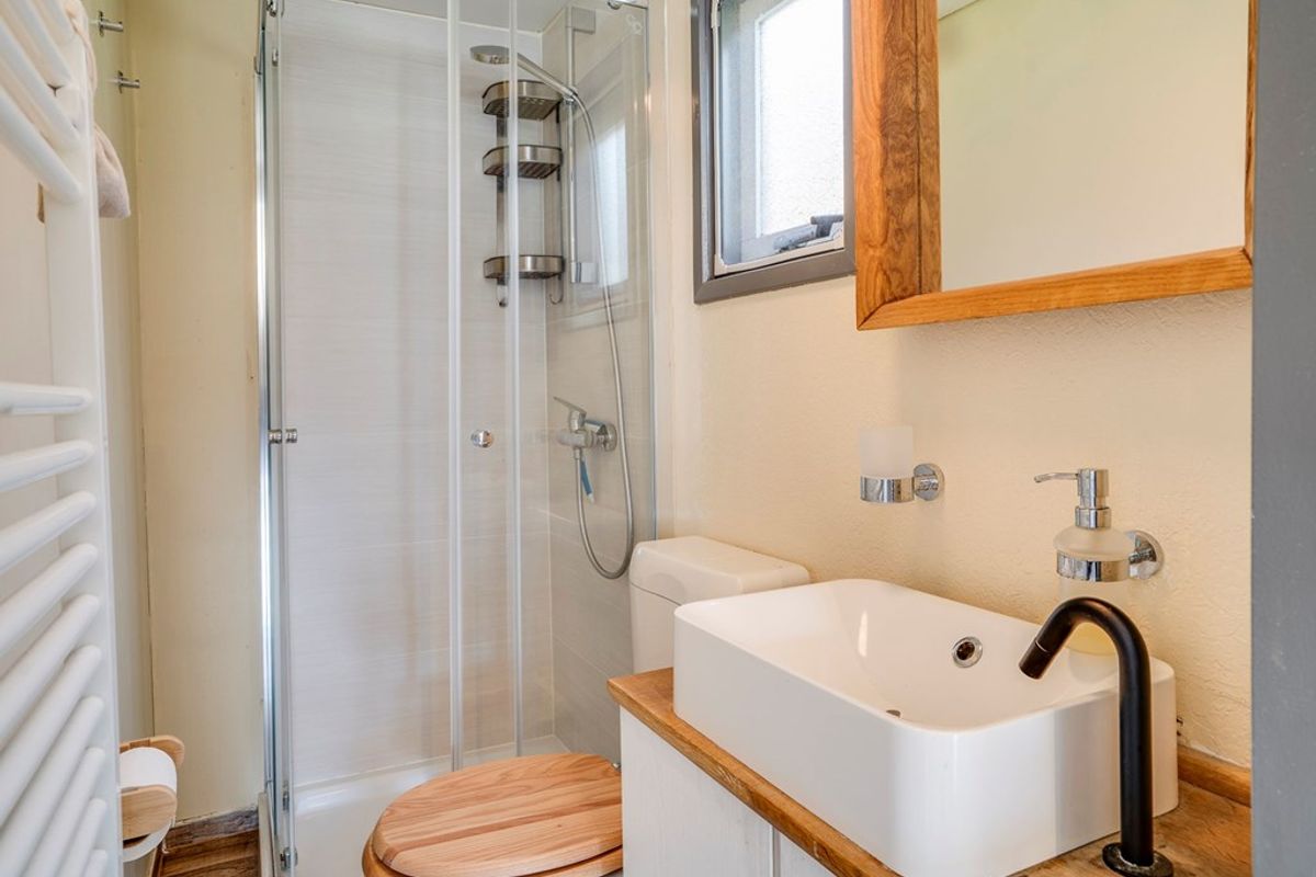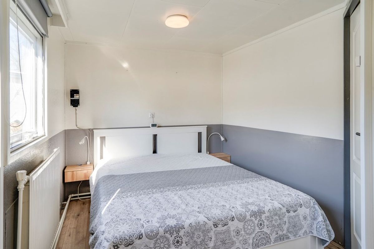 Oorspronkelijk beschikt het chalet over twee slaapkamers, momenteel samengevoegd tot één royale slaapkamer. Indien gewenst is de oorspronkelijke indeling eenvoudig te herstellen. De badkamer is in 2023 volledig vernieuwd en voorzien van een douche, toilet en wastafel – strak, fris en instapklaar.