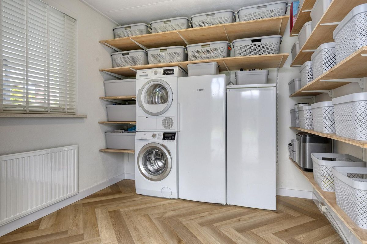 De woning beschikt over een stenen garage met carport, bereikbaar via een ruime oprit. Onder de carport is bovendien een laadpaal aanwezig, ideaal voor het opladen van een elektrische auto. De garage is voorzien van een sectionaaldeur en heeft een loopdeur naar de achtertuin.