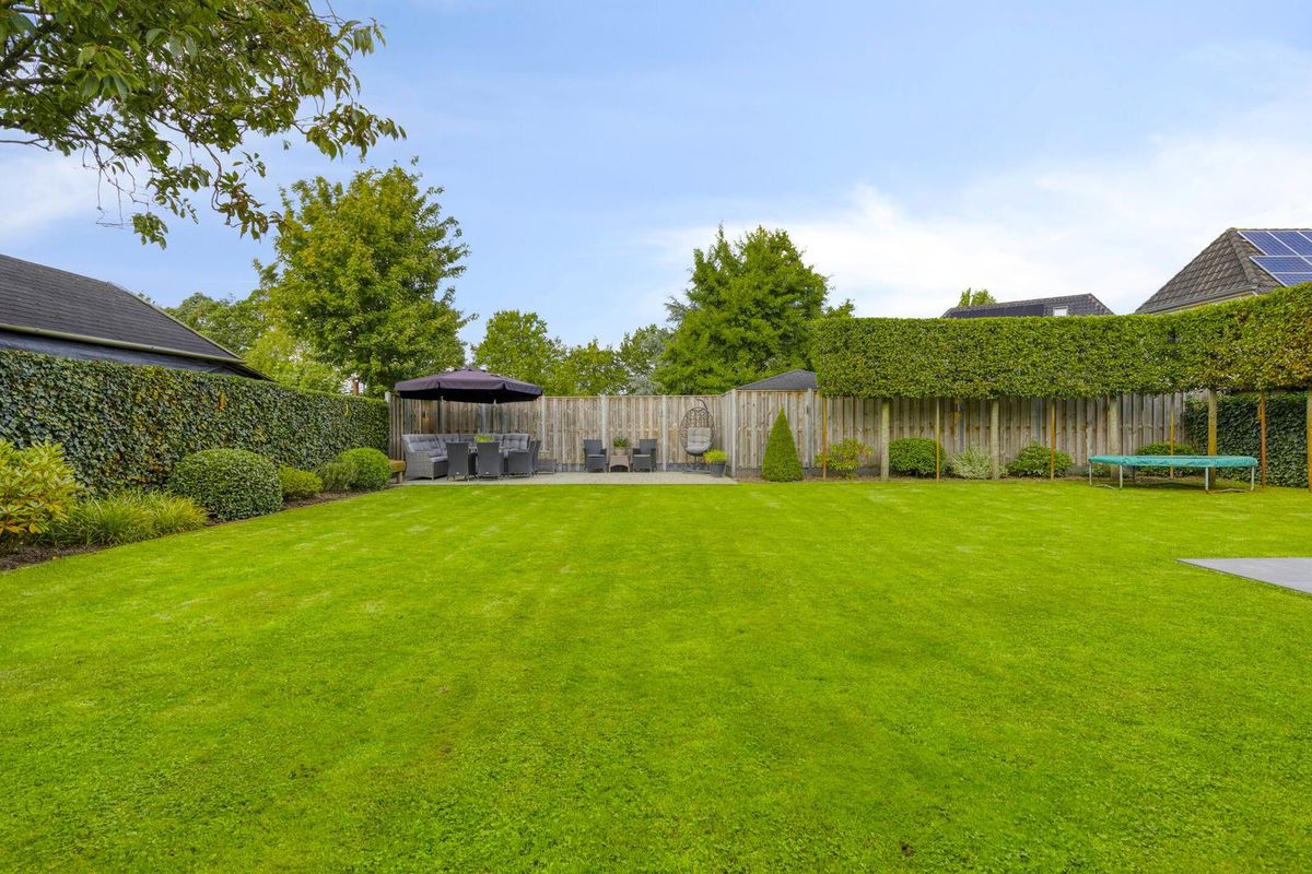 De voortuin is fraai aangelegd met sierbestrating naar de voordeur. Tevens zijn er mooie borders voorzien van sierkiezels, en de voortuin is omheind met een groene haag. De fraai aangelegde achtertuin is royaal van opzet en beschikt over een prachtig onderhouden gazon, een sfeervol terras, kleurrijke plantenborders en volwassen bomen. Doordat de beplanting wintervast is, behoudt de tuin ook in de winter zijn aantrekkelijke uitstraling. De royale serre is eenvoudig bij de tuin te betrekken middels de schuifpuien. De tuin biedt veel privacy en heeft toegang tot de garage. Vanuit de serre is ook een houten berging toegankelijk. Tevens is er een grondwaterinstallatie aanwezig.