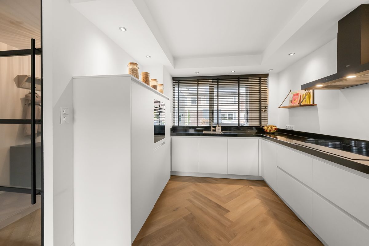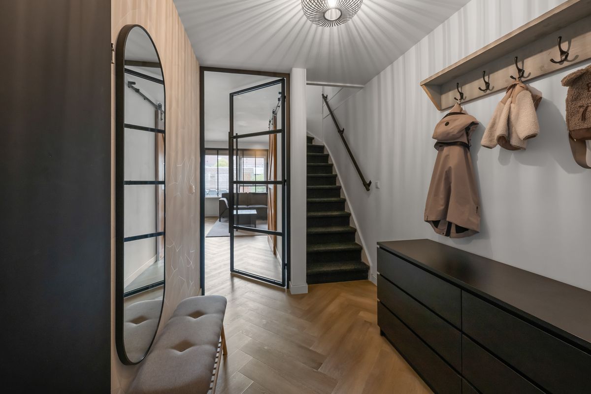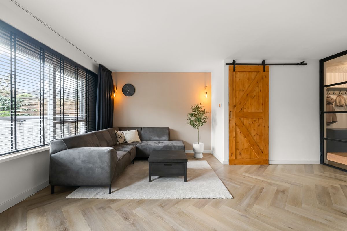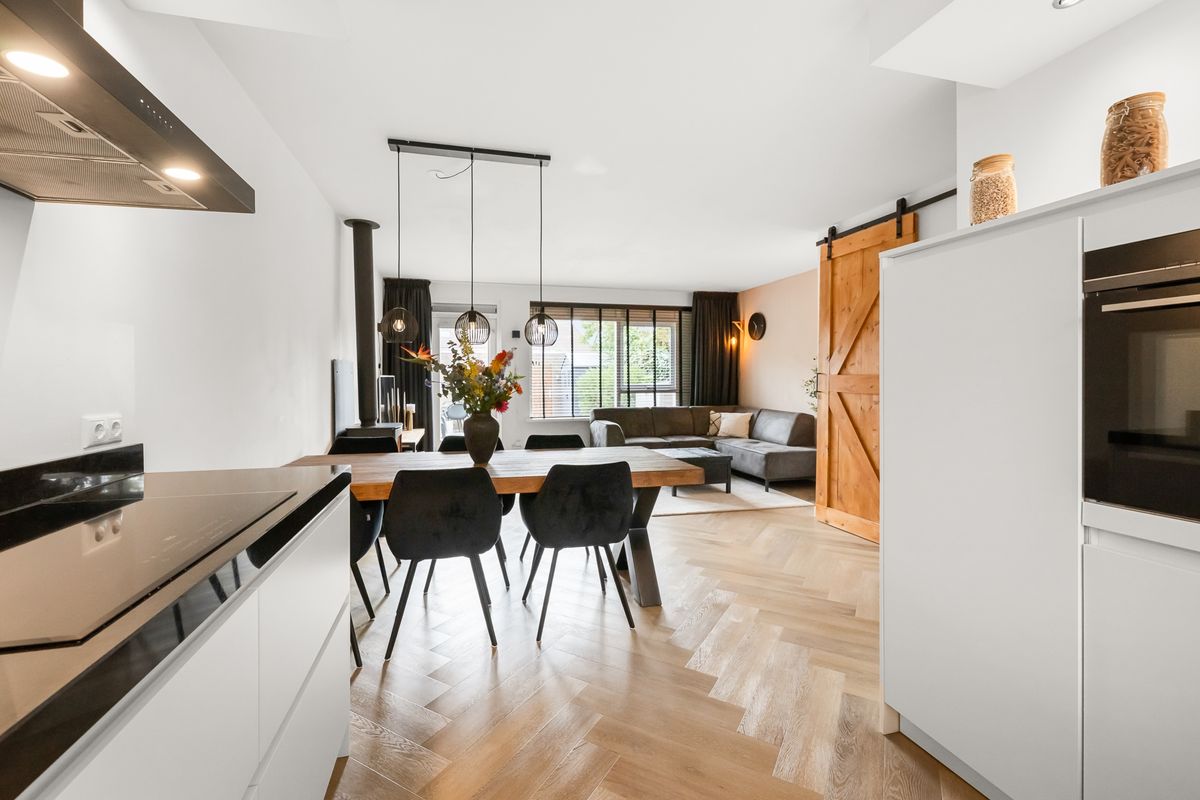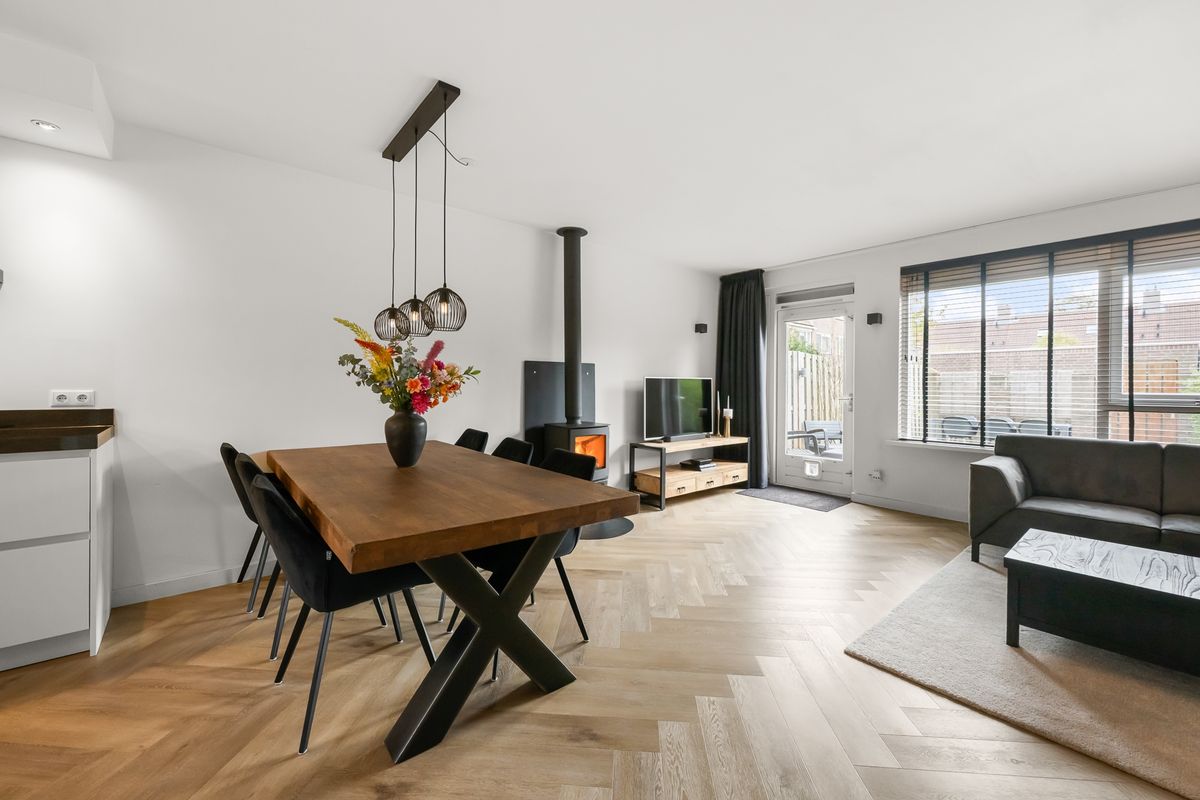 Bij binnenkomst valt direct de moderne afwerking en warme sfeer op. De woonkamer is tuingericht en voorzien van een prachtige visgraatvloer met vloerverwarming en grote ramen die zorgen voor veel lichtinval. Voor extra sfeer en warmte is er een knusse houtkachel aanwezig. De moderne keuken (2021) is volledig uitgerust met een inductiekookplaat, koel-/vriescombinatie, vaatwasser, afzuigkap en handige opberglades. De stalen deur naar de hal geeft de ruimte een stoere, eigentijdse uitstraling. Daarnaast is er een praktische trapkast aanwezig en toegang tot de verzorgde achtertuin.