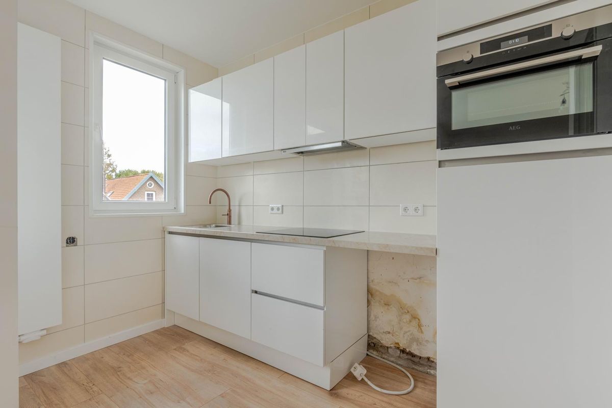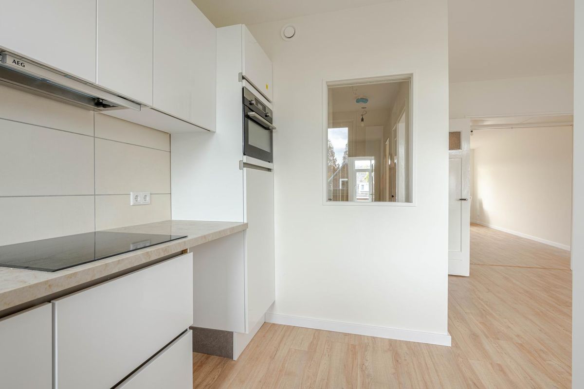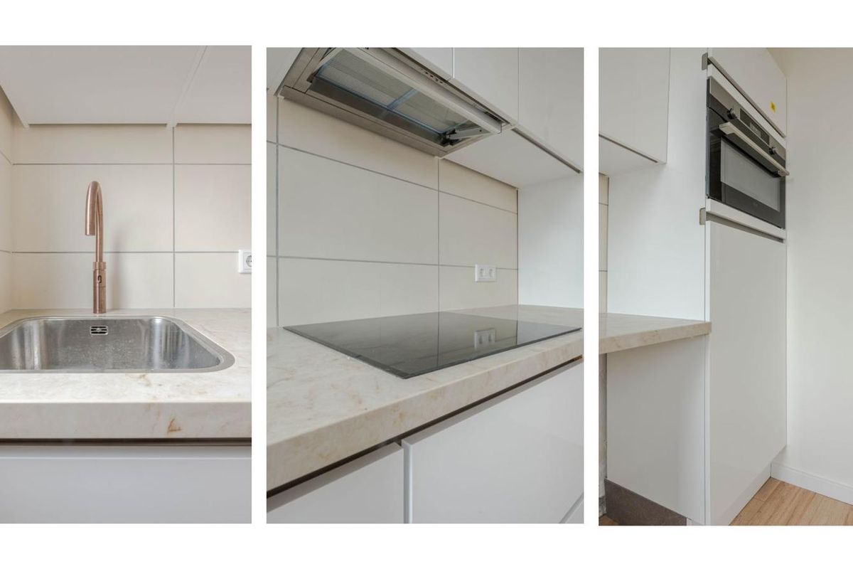 * Keukenruimte voorzien van betegelde wanden, designradiator en een moderne inbouwkeuken met inbouwapparatuur: Quooker-kraan, inductiekookplaat, afzuigkap, combi-oven, koelkast met vriesvak, vaatwasmachine en wasmachine-aansluiting; deur naar het balkon.