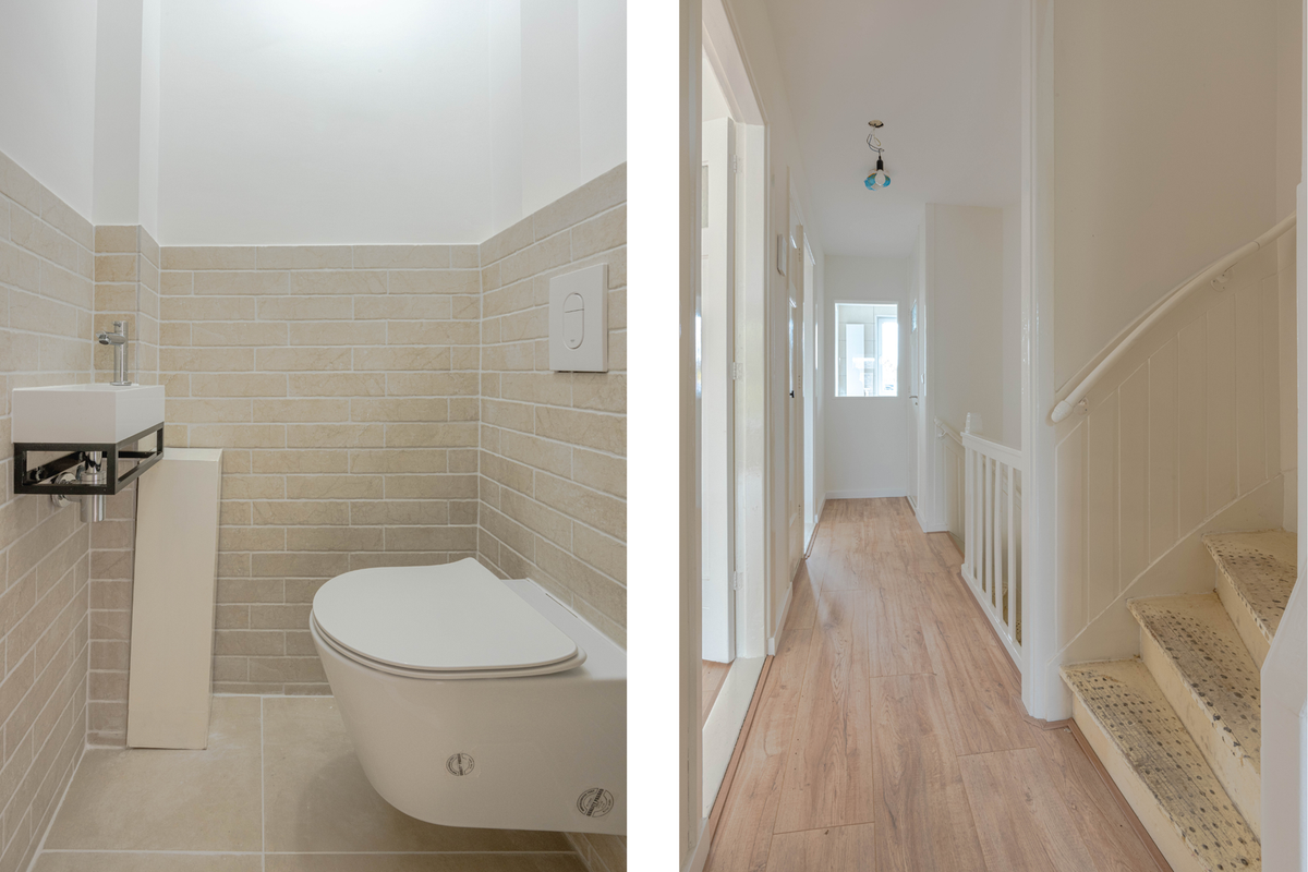 * Toiletruimte deels voorzien van moderne betegeling, wandtoilet en fonteintje.