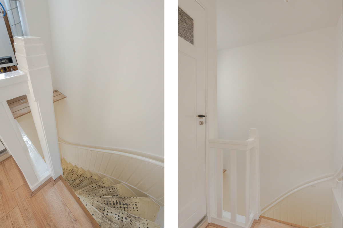 * Woningentree op de eerste verdieping met trapopgang naar de woonverdieping; hal met trapopgang naar de slaapverdieping en toegang tot de verschillende vertrekken.