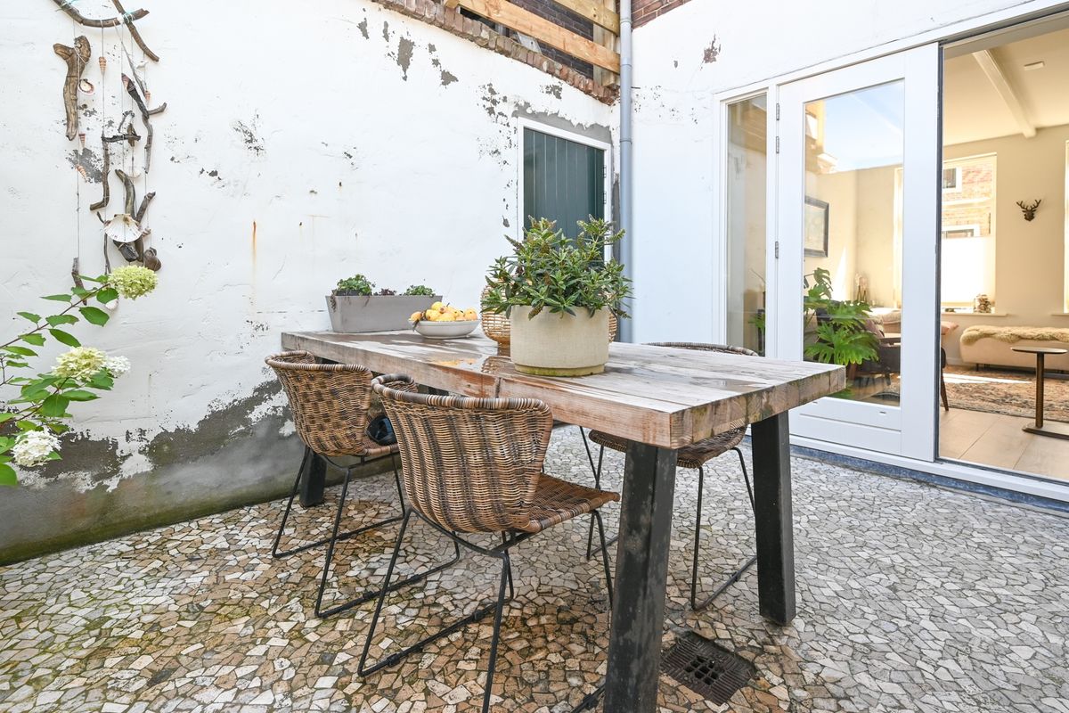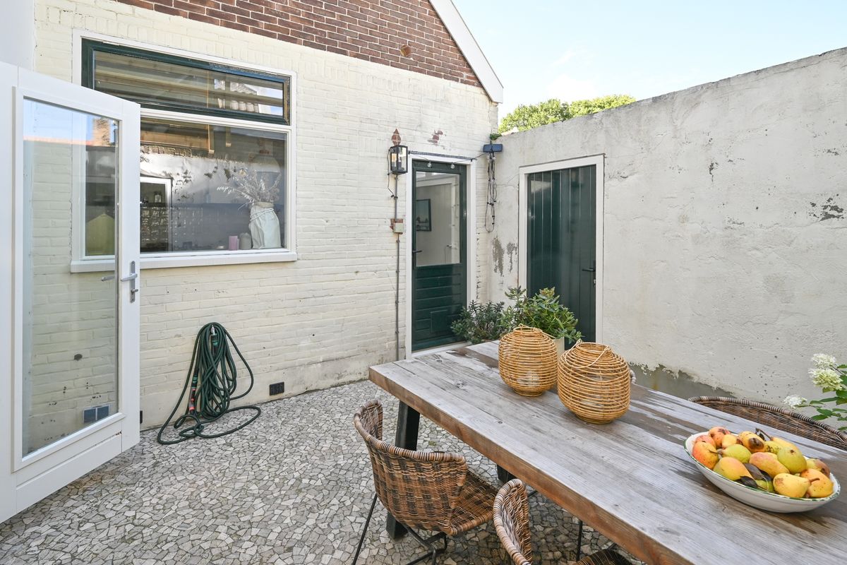 De woning beschikt over een sfeervolle patio bereikbaar vanuit de keuken en woonkamer. De patio beschikt over een achterom die lijdt naar de Zeevaartschoolstraat middels een steeg.