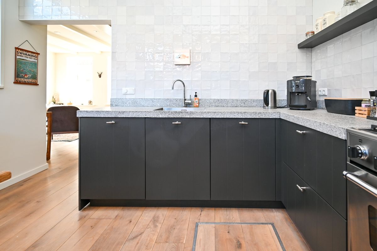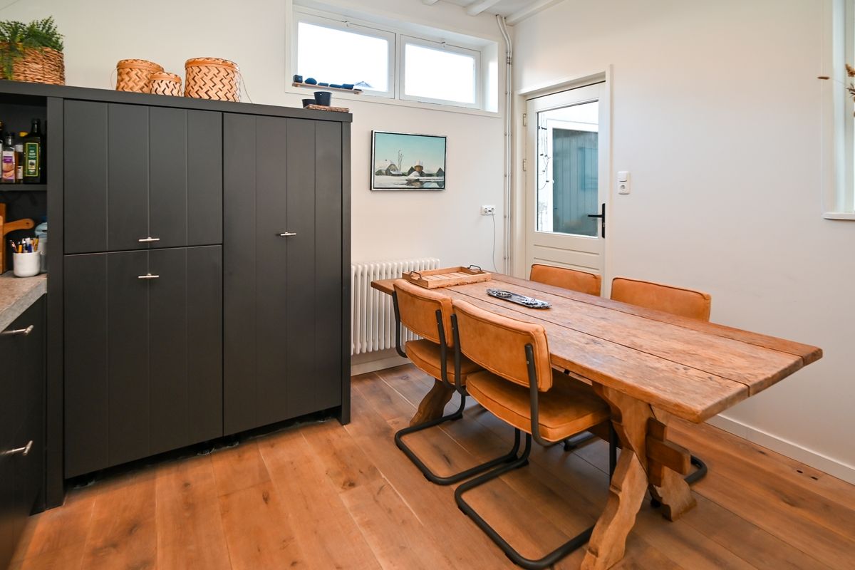 Bij binnenkomst wordt u verwelkomd door een fraaie entreehal met een stijlvolle grindvloer en een elegant toilet. Via de brede schuifdeuren betreedt u de lichte en ruime woonkamer, waar een massief eiken vloer en een hoog balkenplafond zorgen voor een warme, uitnodigende sfeer. De royale woonkeuken, ontworpen door Piet Boon, is een waar pronkstuk. Met een royaal eetgedeelte is dit dé plek voor gezellige avonden met vrienden en familie.