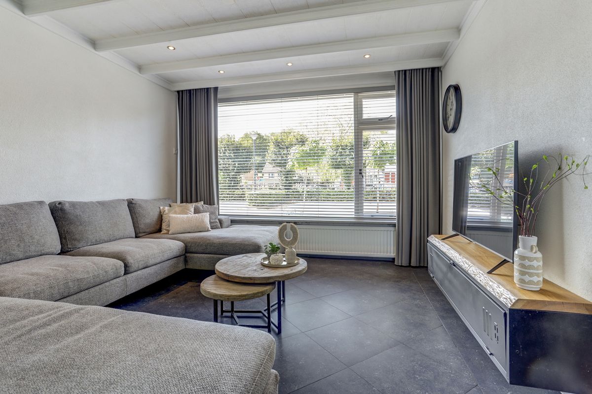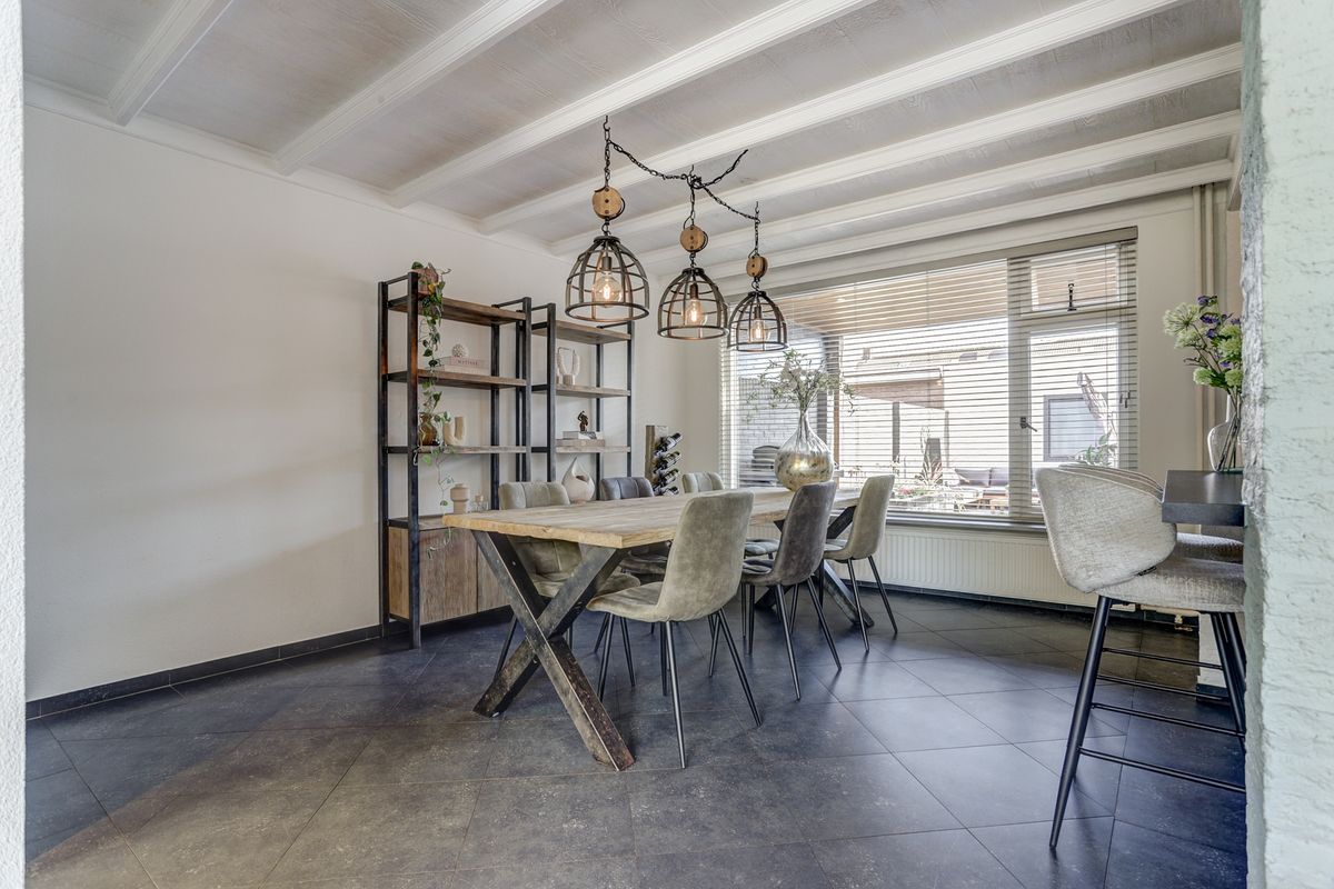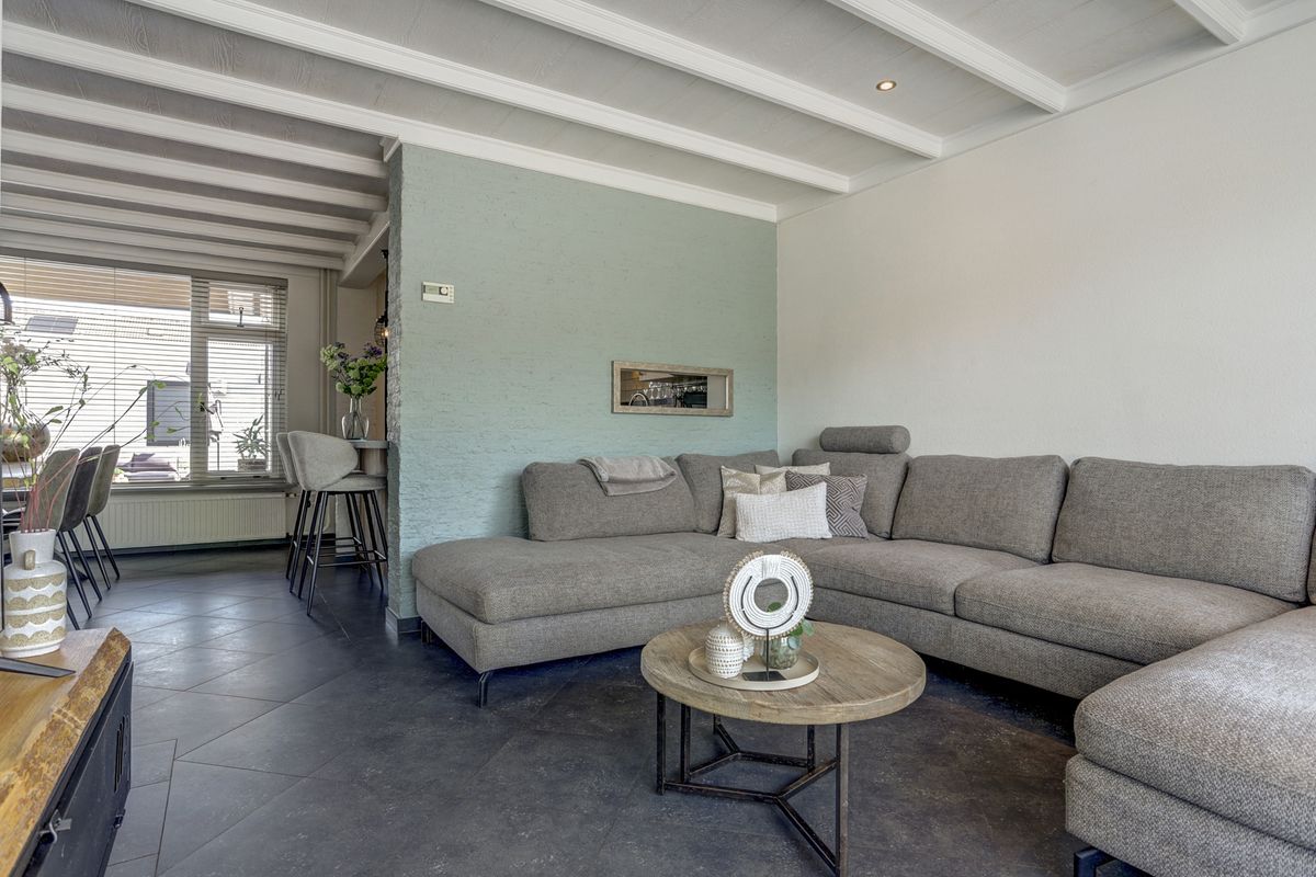 De sfeervolle woonkamer is ruim van opzet en is opgedeeld in een zithoek en eethoek. Voor in de woning bevindt zich de zithoek met veel daglichttoetreding en kun je na een lange dag heerlijk tot rust komen De eethoek biedt genoeg ruimte voor een grote eettafel met uitzicht over de keuken en achtertuin. Verder is de woonkamer nog voorzien van een kelderkast wat ideaal is voor extra opslag. De woonkamer is netjes afgewerkt met een grijze tegelvloer en balkenplafond met inbouwspots.