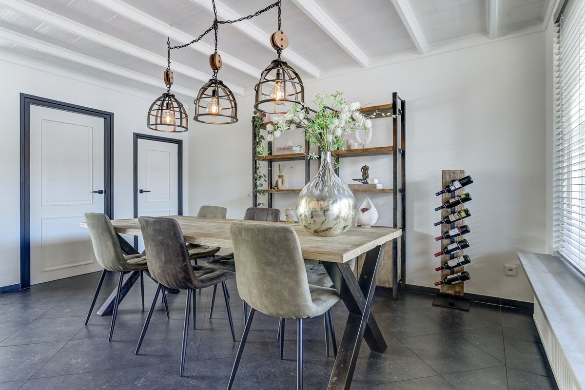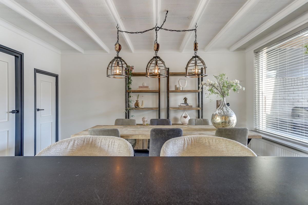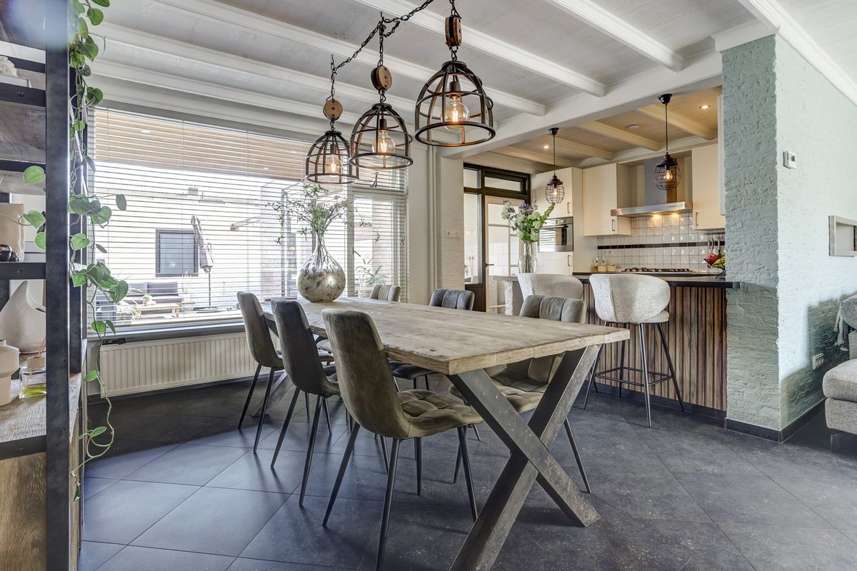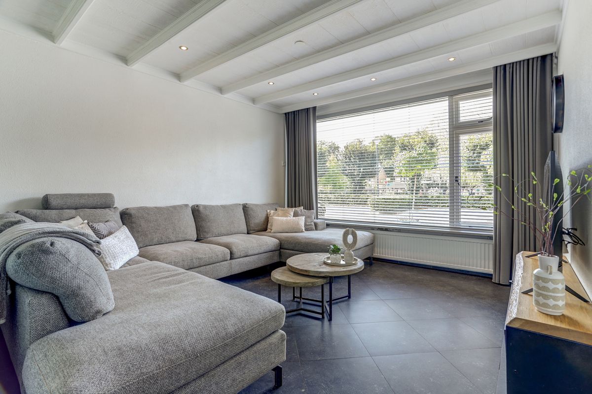 De sfeervolle woonkamer is ruim van opzet en is opgedeeld in een zithoek en eethoek. Voor in de woning bevindt zich de zithoek met veel daglichttoetreding en kun je na een lange dag heerlijk tot rust komen De eethoek biedt genoeg ruimte voor een grote eettafel met uitzicht over de keuken en achtertuin. Verder is de woonkamer nog voorzien van een kelderkast wat ideaal is voor extra opslag. De woonkamer is netjes afgewerkt met een grijze tegelvloer en balkenplafond met inbouwspots.