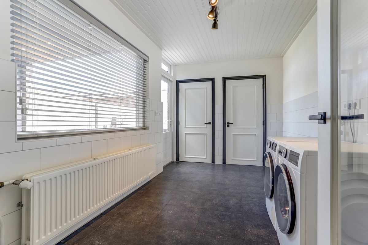 De bijkeuken is netjes afgewerkt en is multifunctioneel te gebruiken. Deze ruimte is voorzien van witgoedaansluitingen, wastafel en er is een mogelijkheid voor het plaatsen van een extra vriezer of koelkast. In het achterste gedeelte is nog een toiletruimte aanwezig voorzien van een hangcloset en fonteintje. Daarlangs bevindt zich nog een inbouwkast wat ideaal is voor extra opslag. Vanuit de bijkeuken heb je toegang tot de tuin met overkapping.