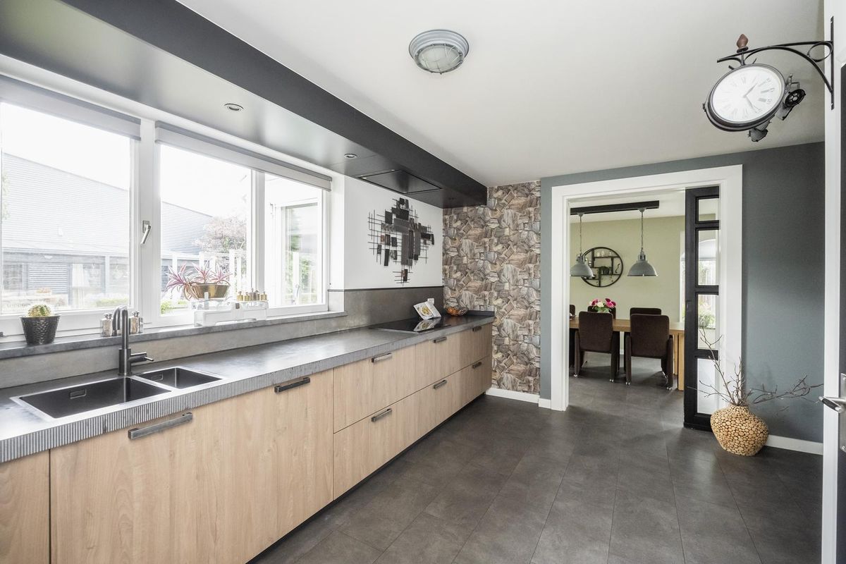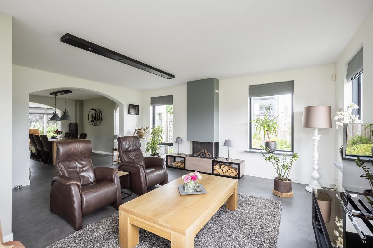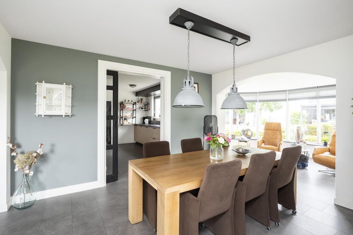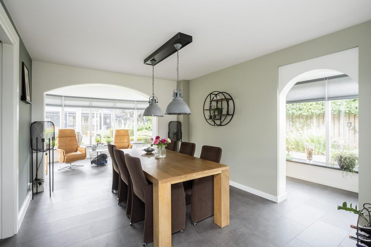 De ruime woonkamer straalt warmte en gezelligheid uit, mede dankzij de gashaard met afstandsbediening. Grote ramen zorgen voor veel daglicht en de airco biedt zowel koelte in de zomer als extra warmte in de winter. Aangrenzend ligt de eetkamer met sfeervolle erker, een heerlijke plek om uitgebreid te tafelen met uitzicht op de tuin. Via een schuifdeur bereikt u de moderne open keuken (2019), voorzien van diverse inbouwapparatuur, veel werk- en bergruimte.